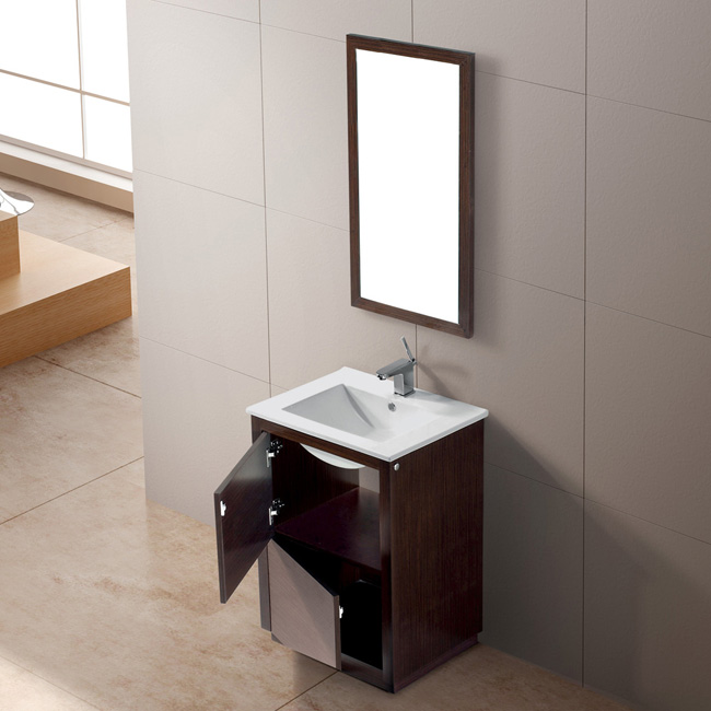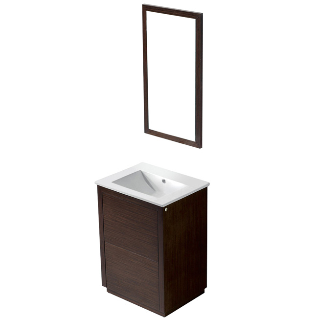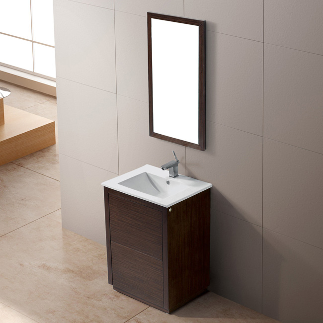 The VIGO Saba Vanity features a white, ceramic sink and a wood-rimmed mirror and