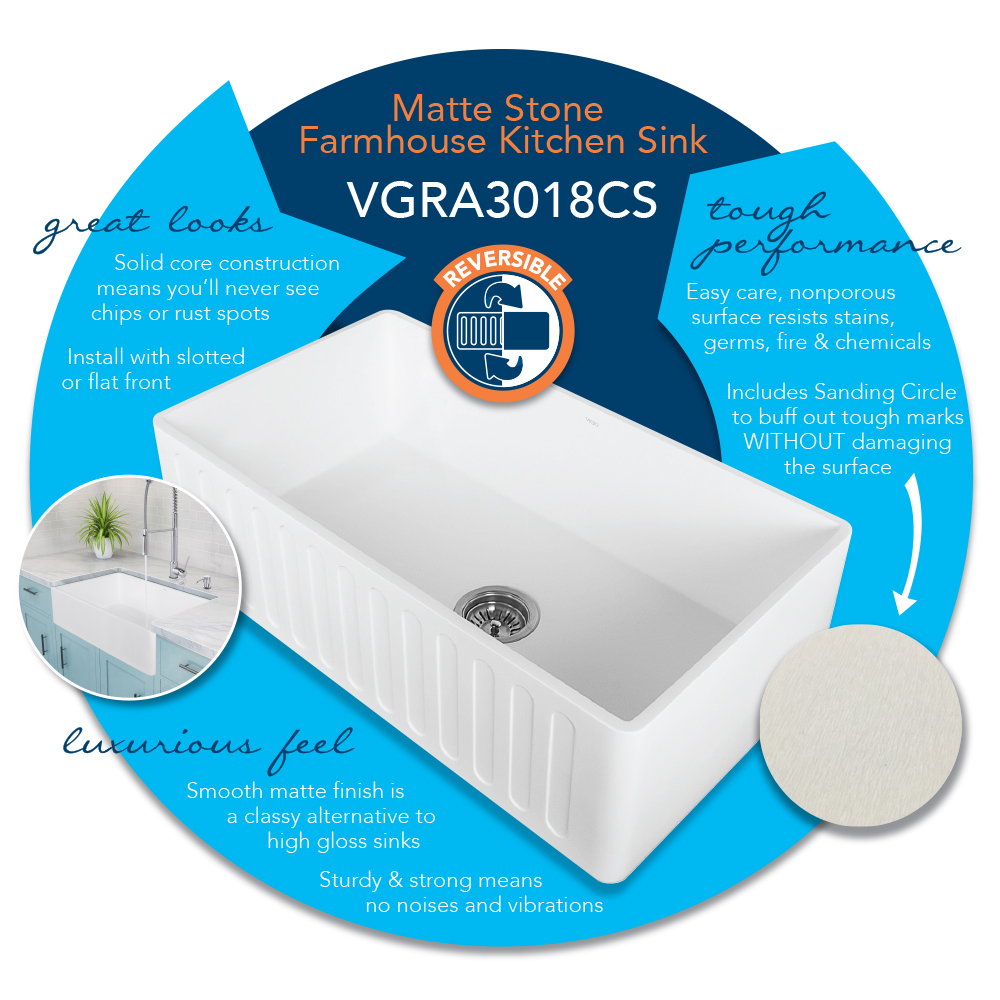 The VGRA3018CS Farmhouse Kitchen Sink has a solid core construction which means you'll never see chips that expose an ugly porous sub-layer