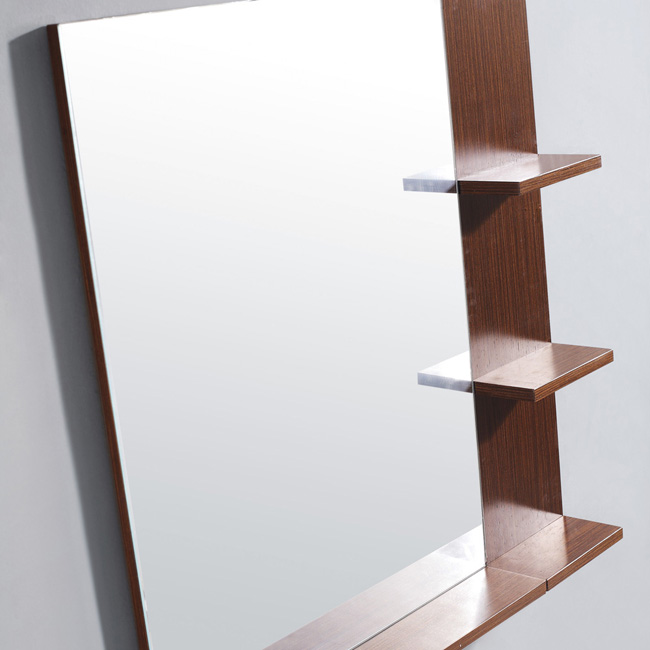 Mirror features one long horizontal shelf and two small shelves on