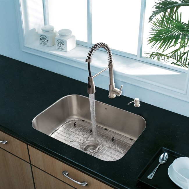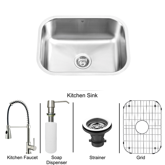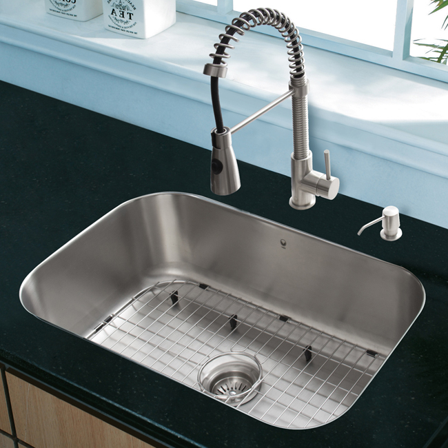 Breathe new life into your kitchen with a VIGO All in One Kitchen Set featuring a 23" Undermount kitchen sink, faucet, soap dispenser, matching bottom grid, and sink strainer.