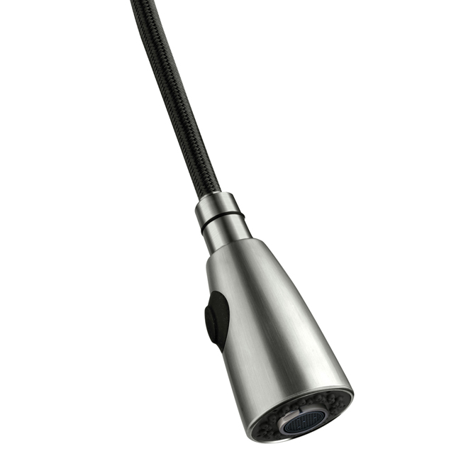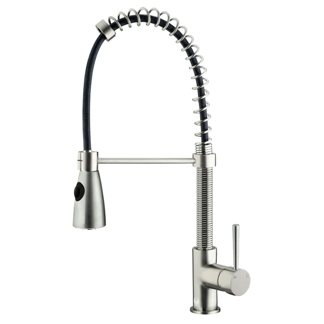 The VG02003ST kitchen faucet features a dual function spiral pull-down spray head for aerated flow or powerful spray, and is made of solid brass with a stainless steel finish.