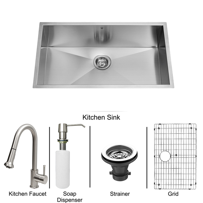 Add some sophistication to your kitchen with a VIGO All in One Kitchen Set featuring a 30" Undermount kitchen sink, faucet, soap dispenser, matching bottom grid, and sink strainer.