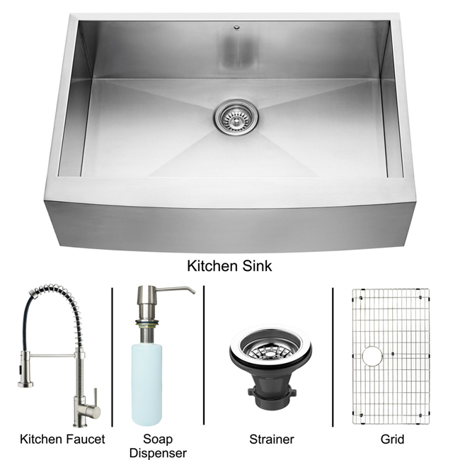 a 33" Farmhouse - Apron Front kitchen sink, faucet, soap dispenser,