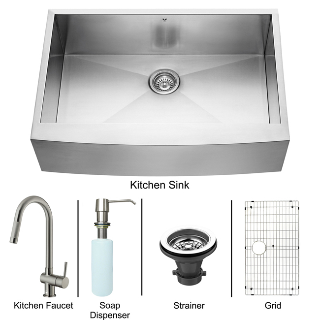 a 33" Farmhouse - Apron Front kitchen sink, faucet, soap dispenser, matching bottom grid and sink strainer.
