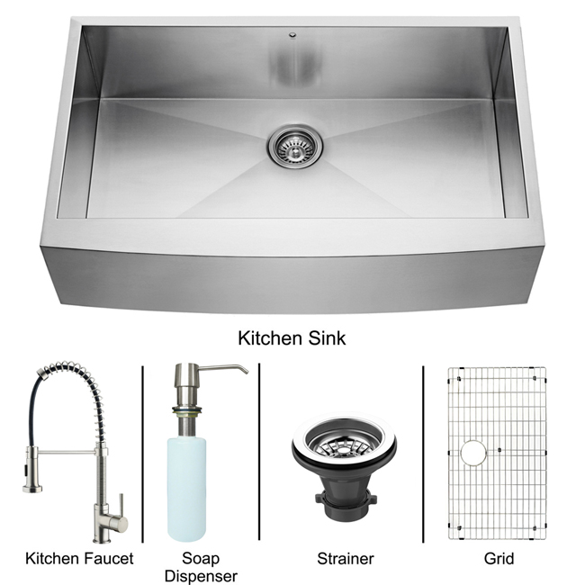 36" Farmhouse - Apron Front kitchen sink, faucet, soap dispenser, matching bottom grid and sink strainer.