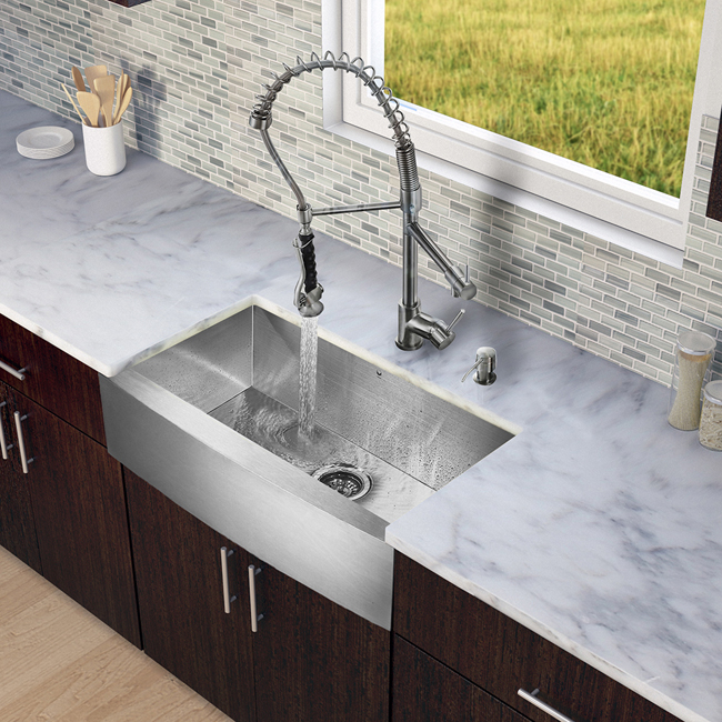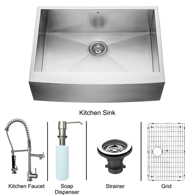 Revitalize the look of your kitchen with a VIGO All in One Kitchen Set featuring a 30" Farmhouse - Apron Front kitchen sink, faucet, soap dispenser, matching bottom grid and sink strainer.