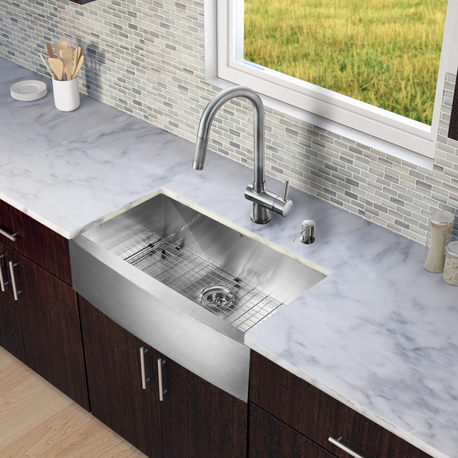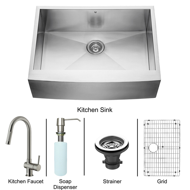 Enhance the look of your kitchen with a VIGO All in One Kitchen Set featuring a 30" Farmhouse - Apron Front kitchen sink, faucet, soap dispenser, matching bottom grid and sink strainer.