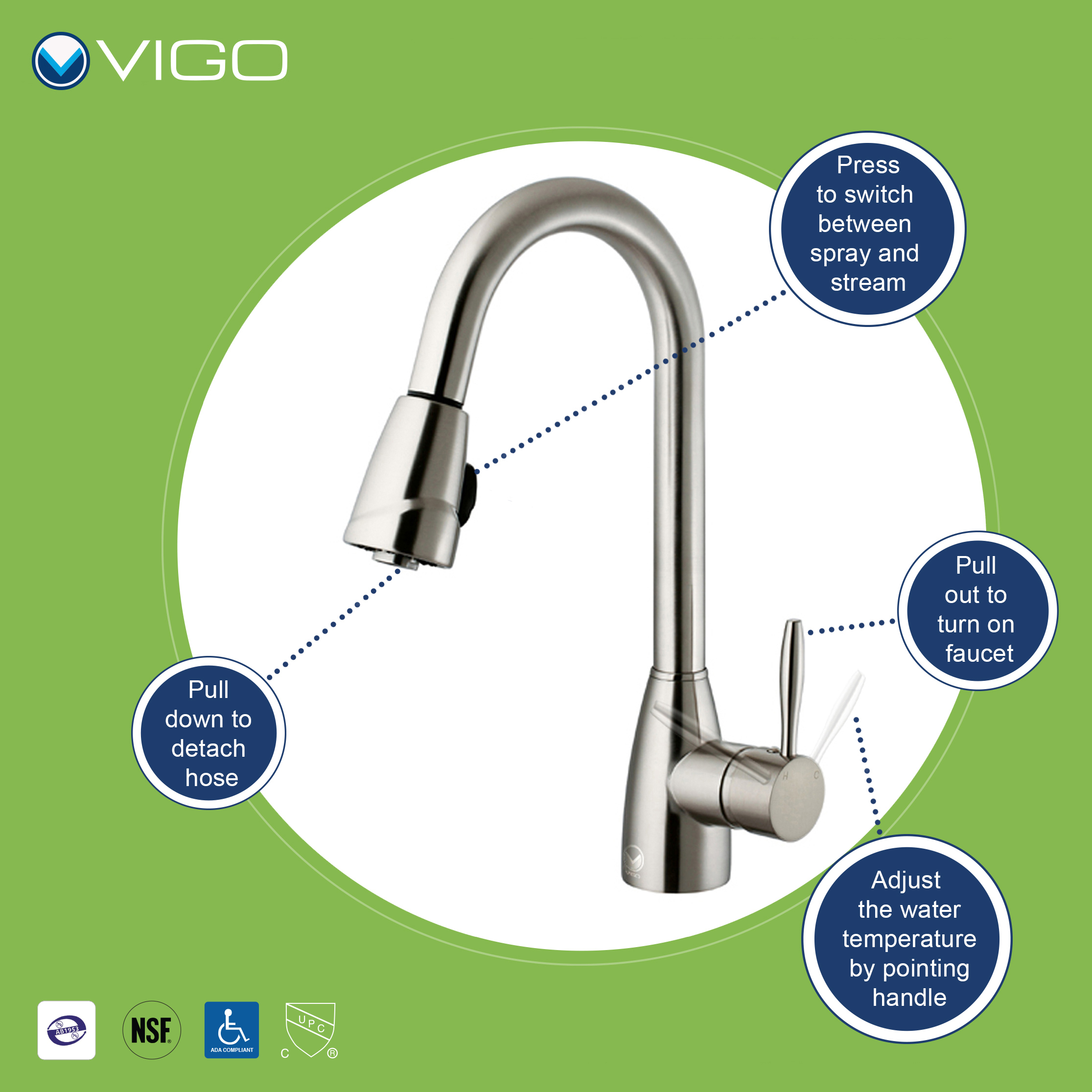Kitchen faucet is cUPC, NSF-61, and AB1953 certified by IAPMO.