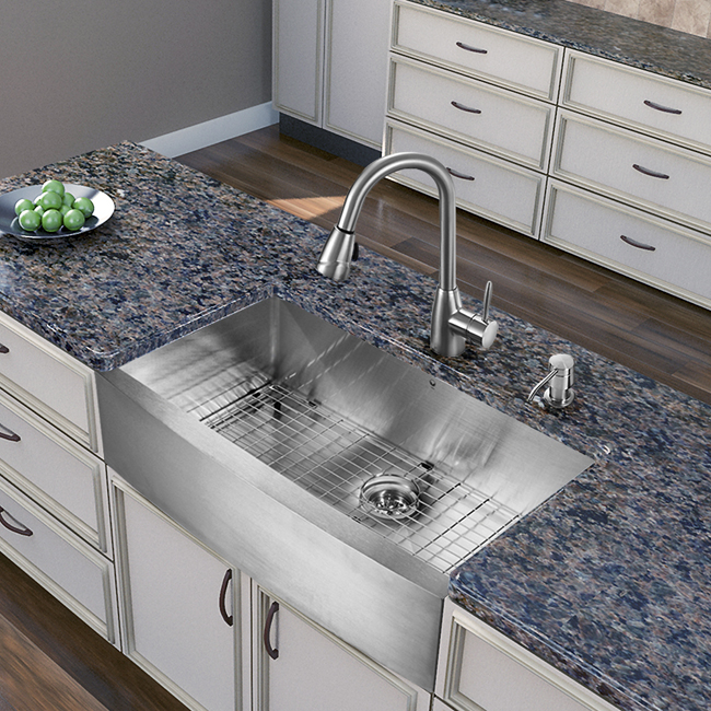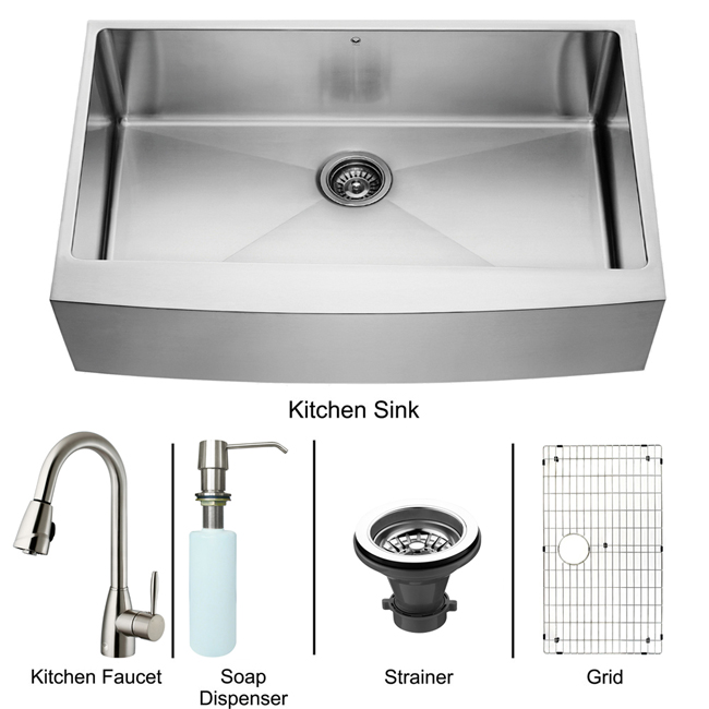 Add elegance and style to your kitchen with a VIGO All in One Kitchen Set featuring a 36" Farmhouse - Apron Front kitchen sink, faucet, soap dispenser, matching bottom grid and sink strainer.