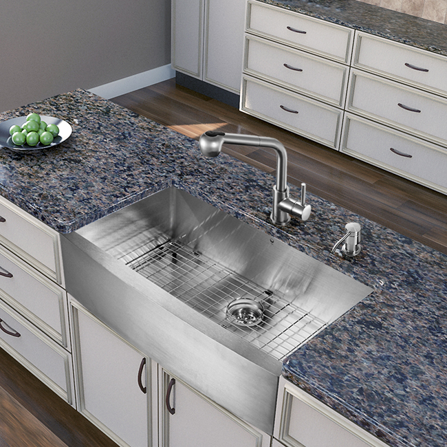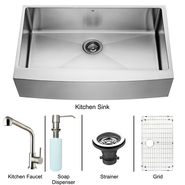 Modernize the look of your entire kitchen with a VIGO All in One Kitchen Set featuring a 36" Farmhouse - Apron Front kitchen sink, faucet, soap dispenser, matching bottom grid and sink strainer.