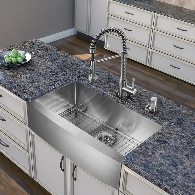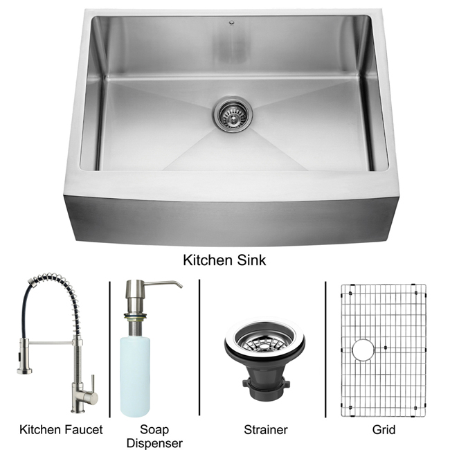 Give your kitchen a complete makeover with a VIGO All in One Kitchen Set featuring a 30" Farmhouse - Apron Front kitchen sink, faucet, soap dispenser, matching bottom grid and sink strainer.