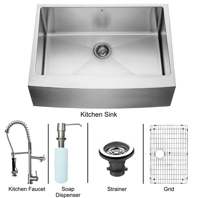 Revitalize the look of your kitchen with a VIGO All in One Kitchen Set featuring a 30" Farmhouse - Apron Front kitchen sink, faucet, soap dispenser, matching bottom grid and sink strainer.