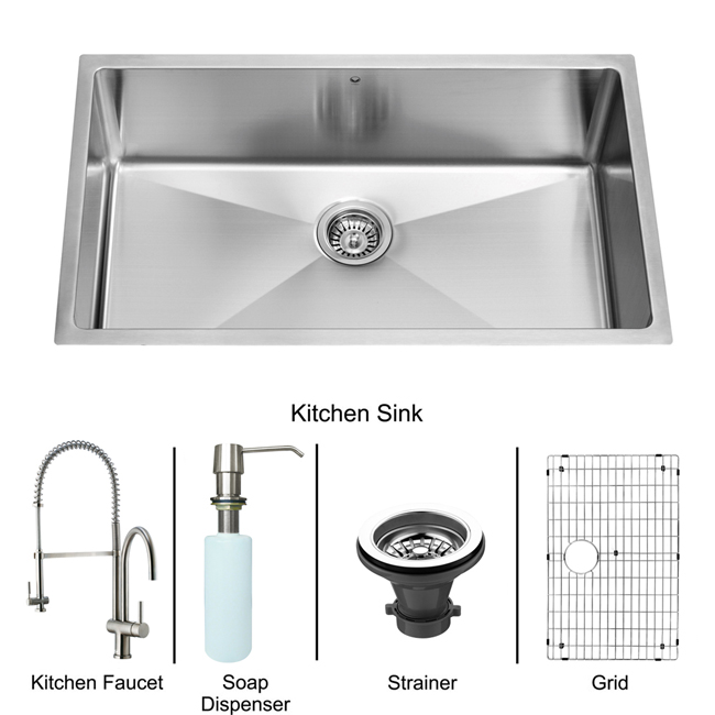 featuring a 32" Undermount kitchen sink, faucet, soap dispenser, matching bottom grid and sink strainer.