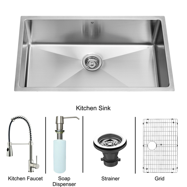 32" Undermount kitchen sink, faucet, soap dispenser, matching bottom grid and sink strainer.
