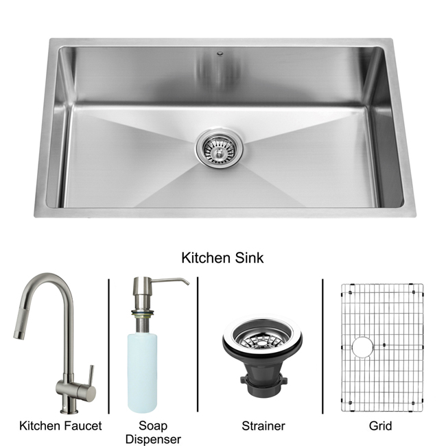 32" Undermount kitchen sink, faucet, soap dispenser, matching bottom grid and sink strainer.