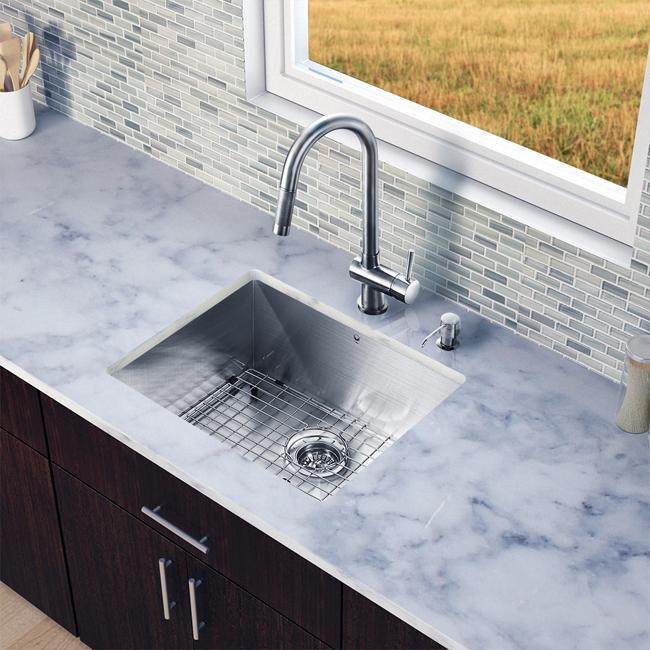 23" Undermount kitchen sink, faucet, soap dispenser, matching bottom grid and sink strainer.