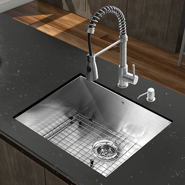 Give your kitchen a complete makeover with a VIGO All in One Kitchen Set featuring a 23" Undermount kitchen sink, faucet, soap dispenser, matching bottom grid, and sink strainer.