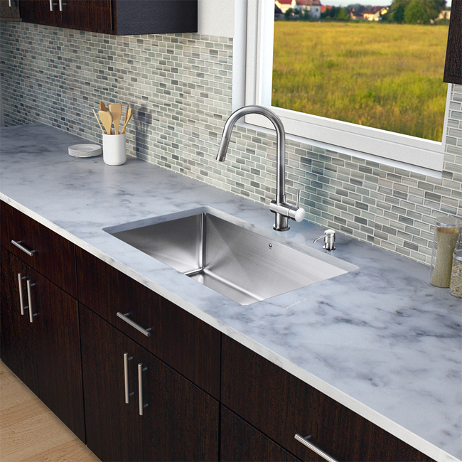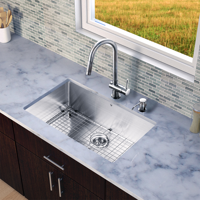 Revitalize the look of your kitchen with a VIGO All in One Kitchen Set featuring a 30" Undermount kitchen sink, faucet, soap dispenser, matching bottom grid and sink strainer.