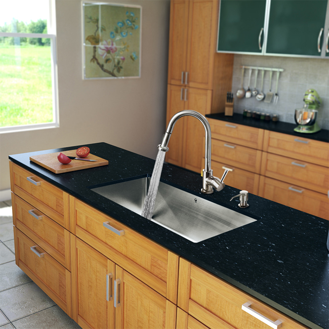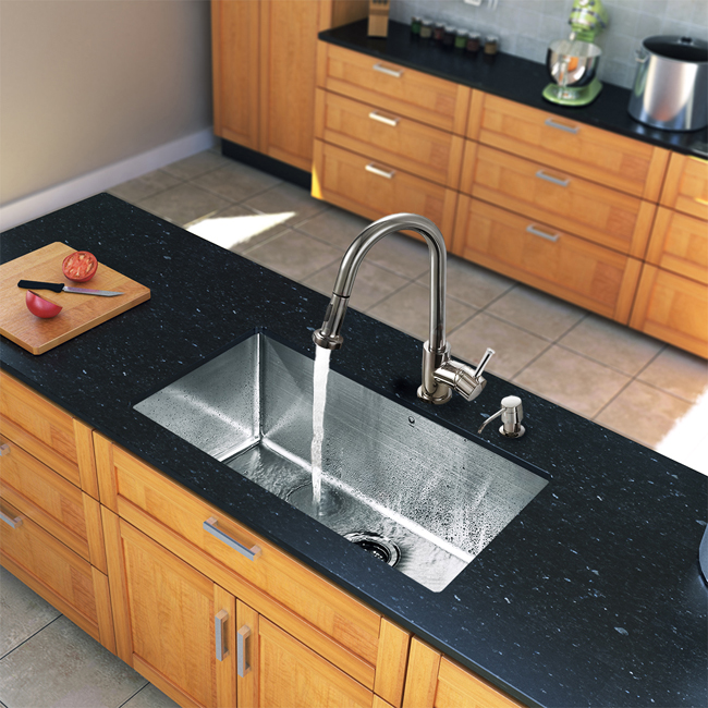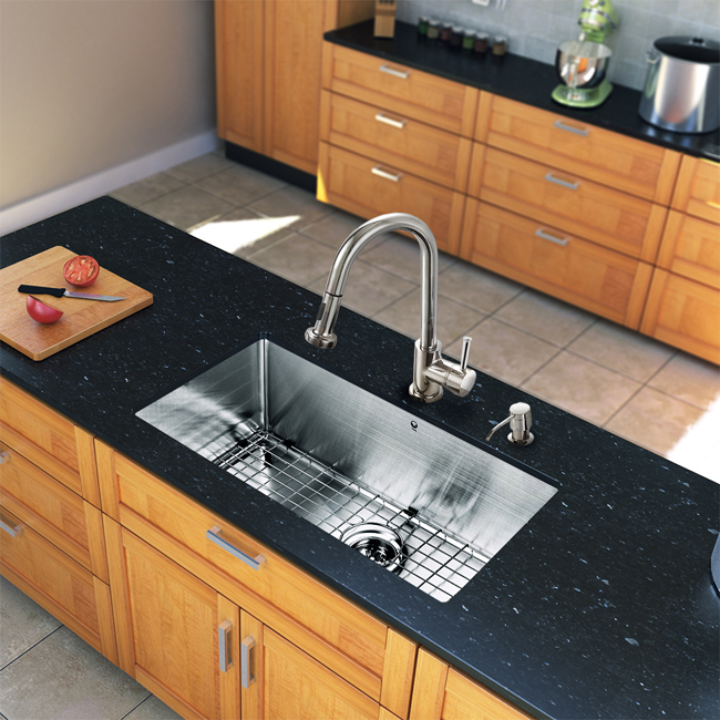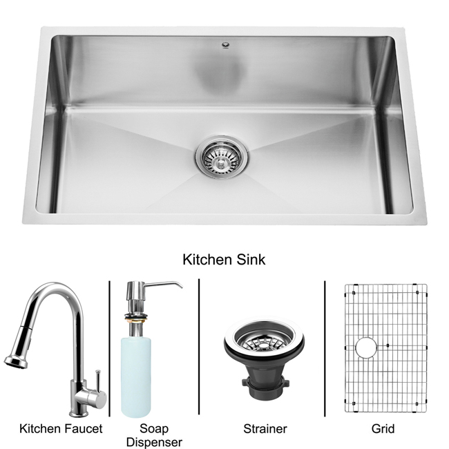 Give your kitchen a complete makeover with a VIGO All in One Kitchen Set featuring a 30" Undermount kitchen sink, faucet, soap dispenser, matching bottom grid and sink strainer.