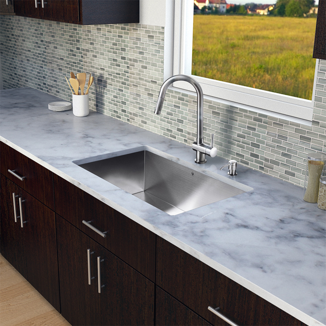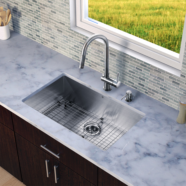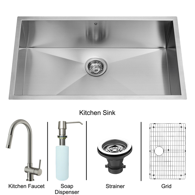 Revitalize the look of your kitchen with a VIGO All in One Kitchen Set featuring a 30" Undermount kitchen sink, faucet, soap dispenser, matching bottom grid and sink strainer.