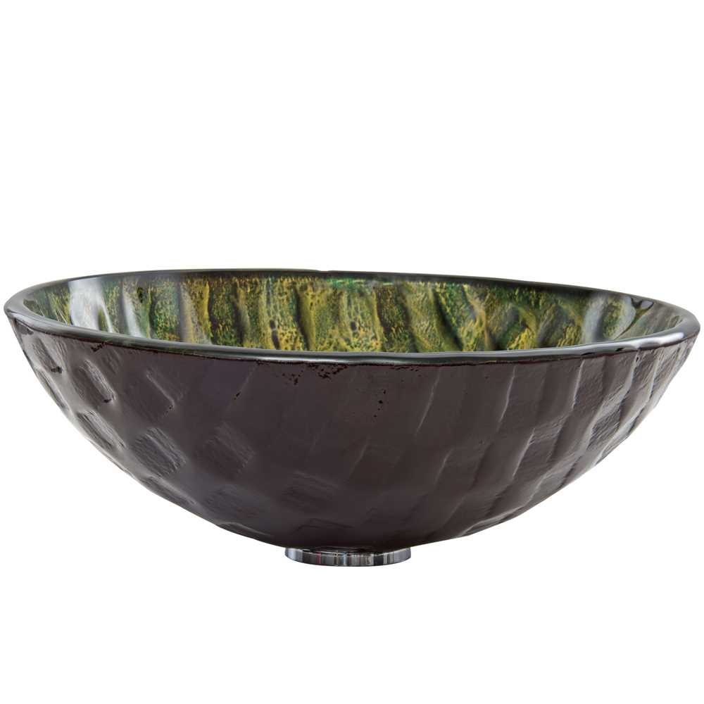 The VG07064 Amazonia glass vessel bowl features a green weave pattern with hints of yellow and gold, glistening like a rainforest after a morning shower.