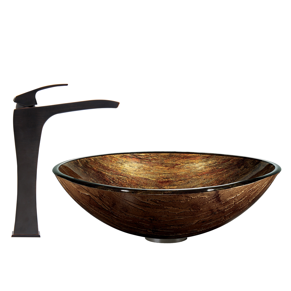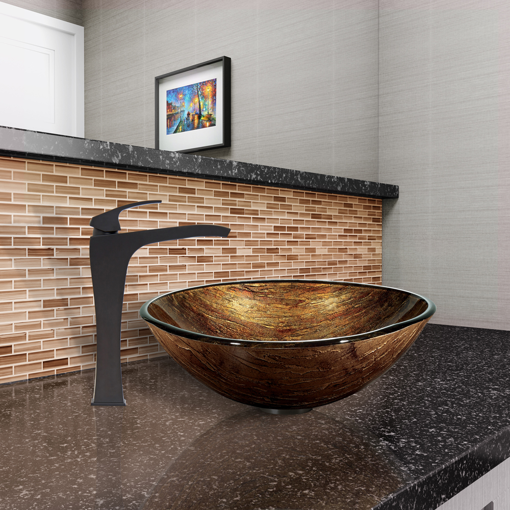 The VIGO Amber Sunset Glass Vessel Sink and Blackstonian Faucet Set in Antique Rubbed Bronze Finish brings to your bathroom a beautiful design and style, worth admiring over and over again.