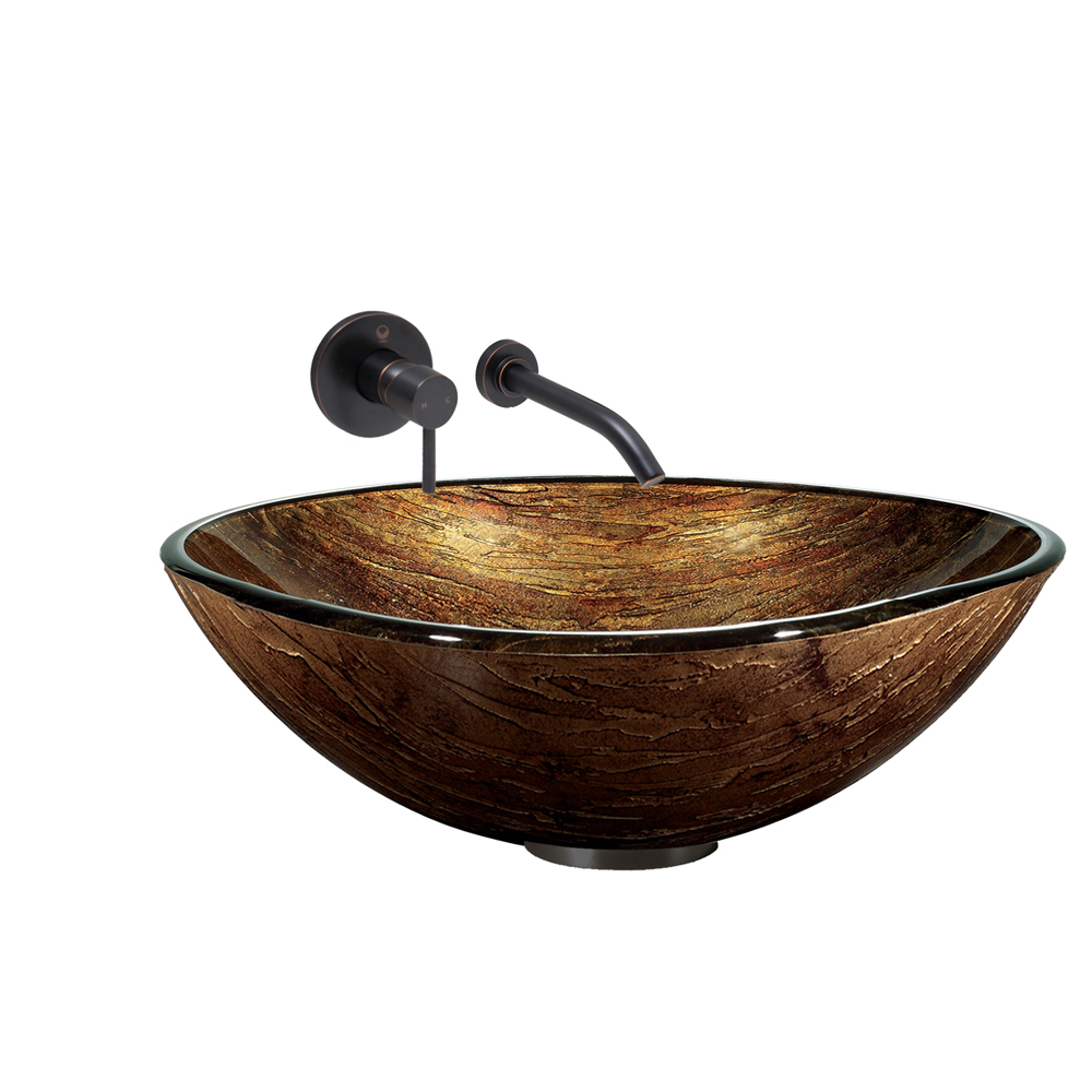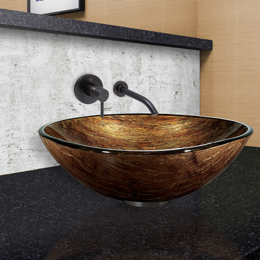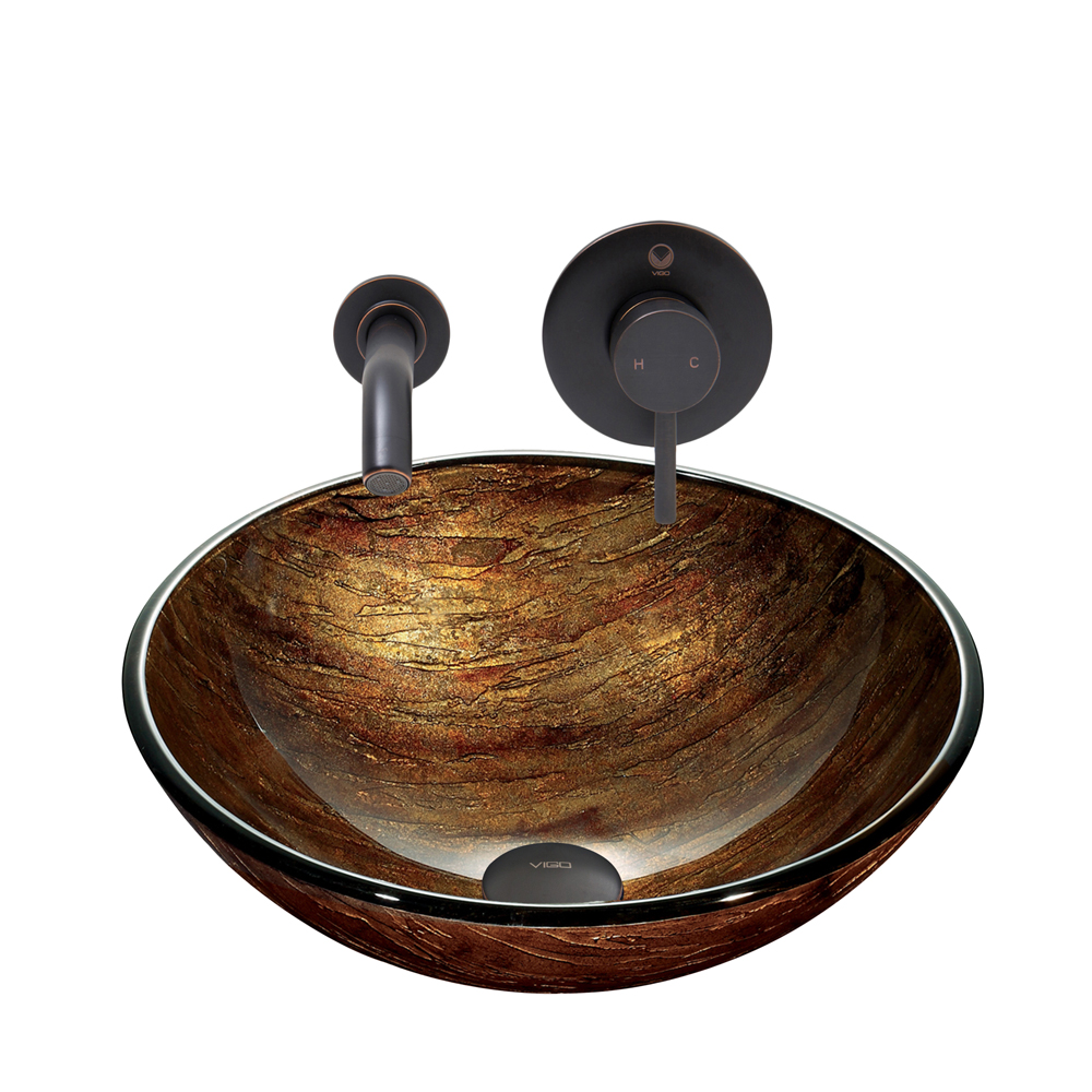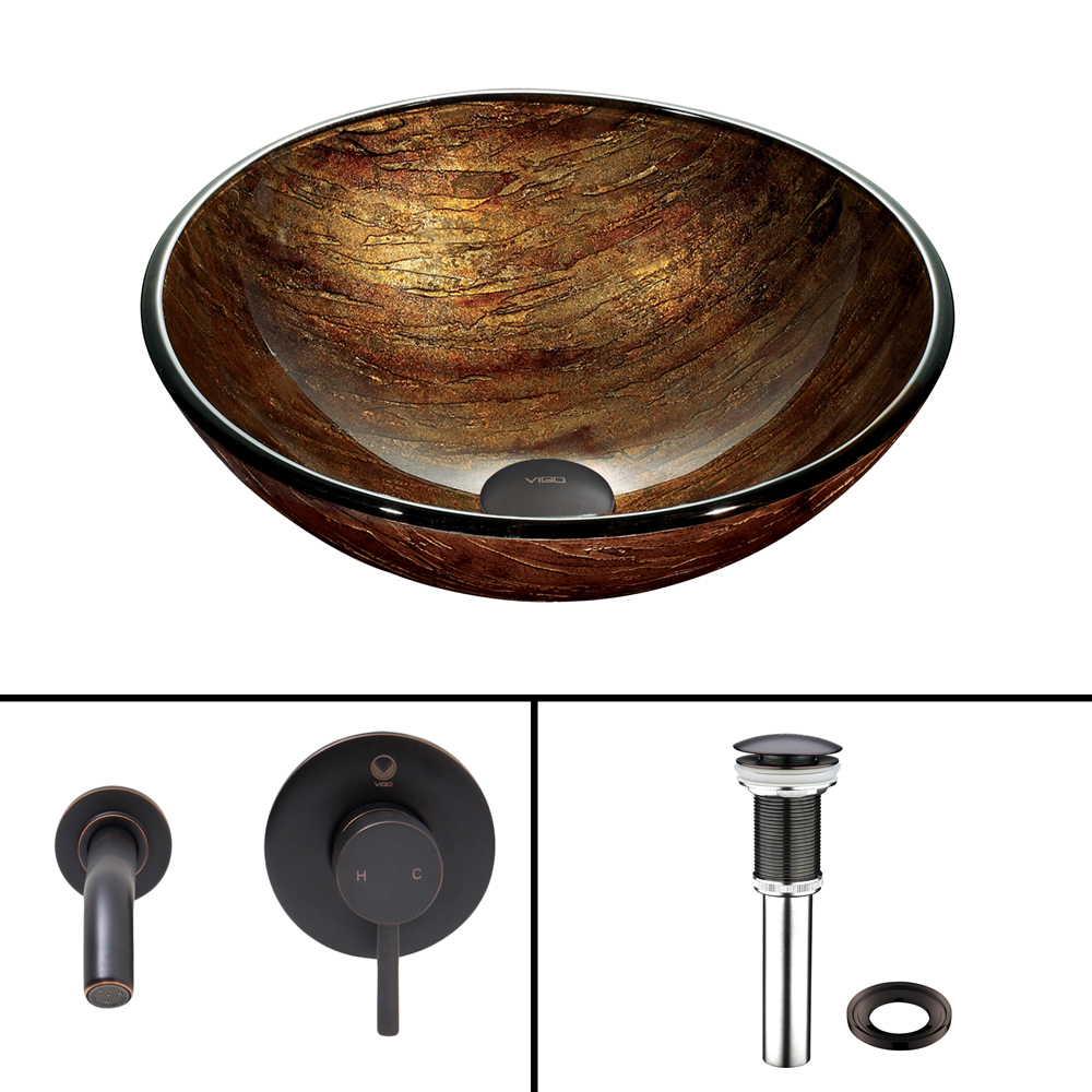The VIGO Amber Sunset Glass Vessel sink and Olus Wall Mount Faucet Set in an Antique Rubbed Finish will radiate a warm tone and elegant presence into any bathroom.