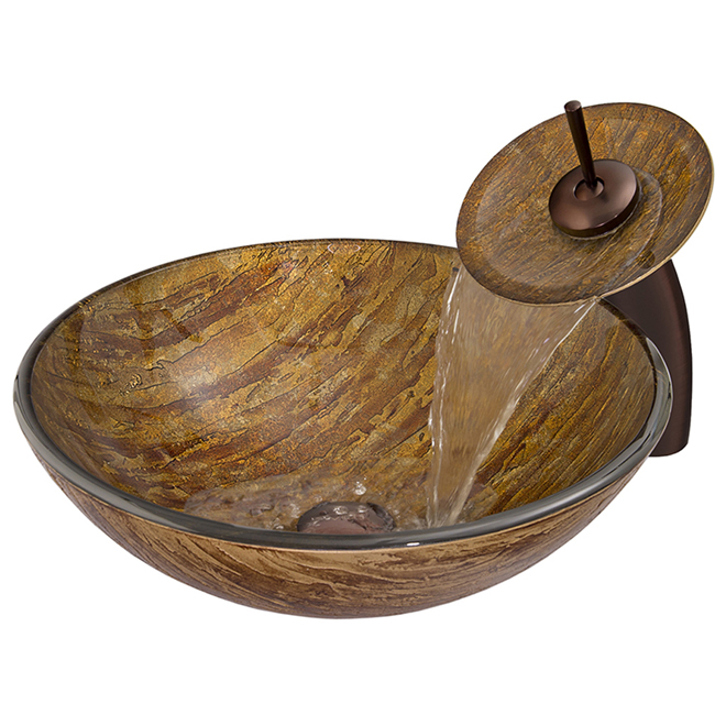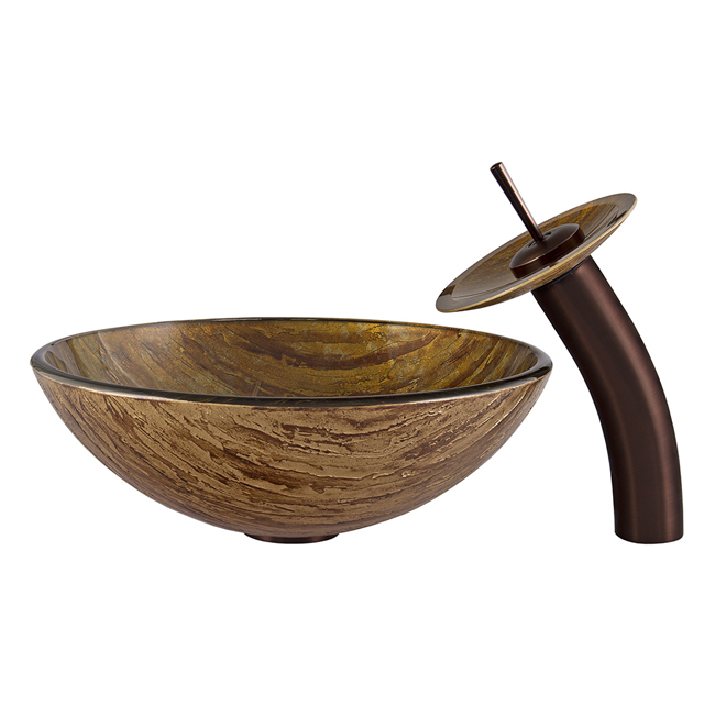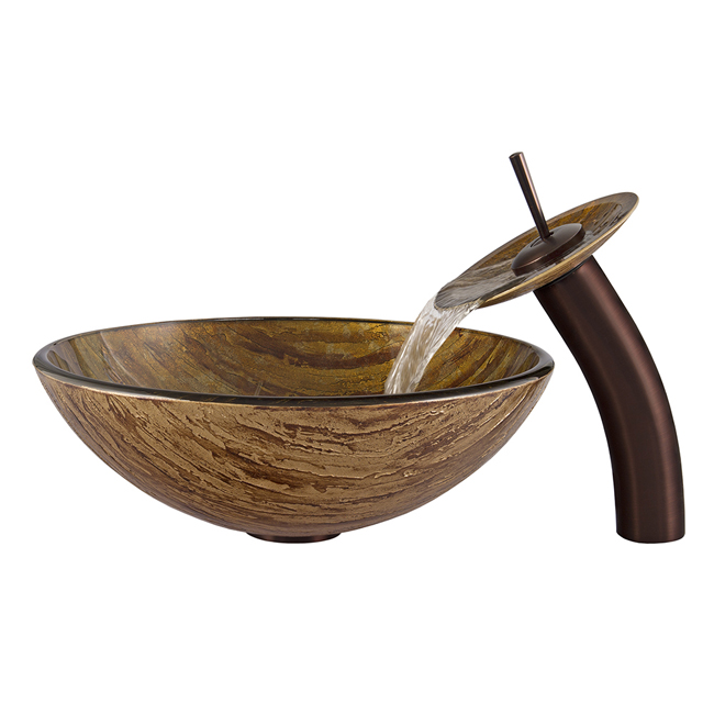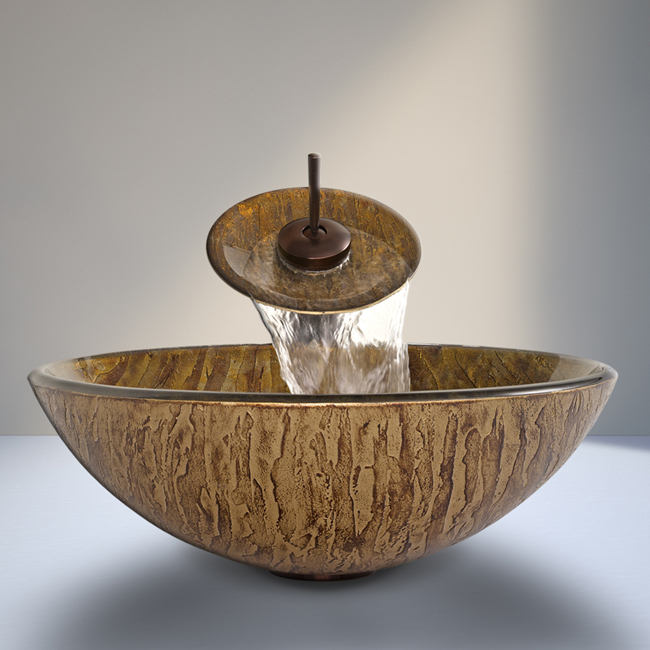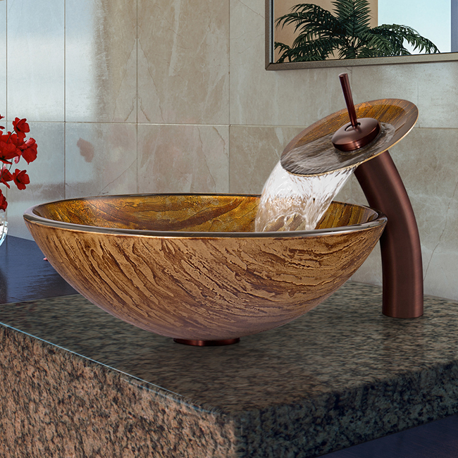 The VIGO Amber Sunset glass vessel sink and matching waterfall faucet set will