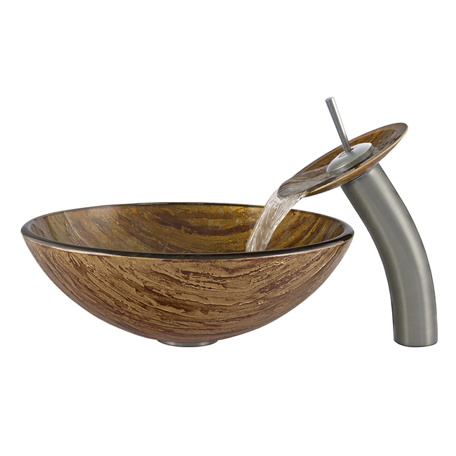 The VIGO Amber Sunset glass vessel sink and matching waterfall faucet set will