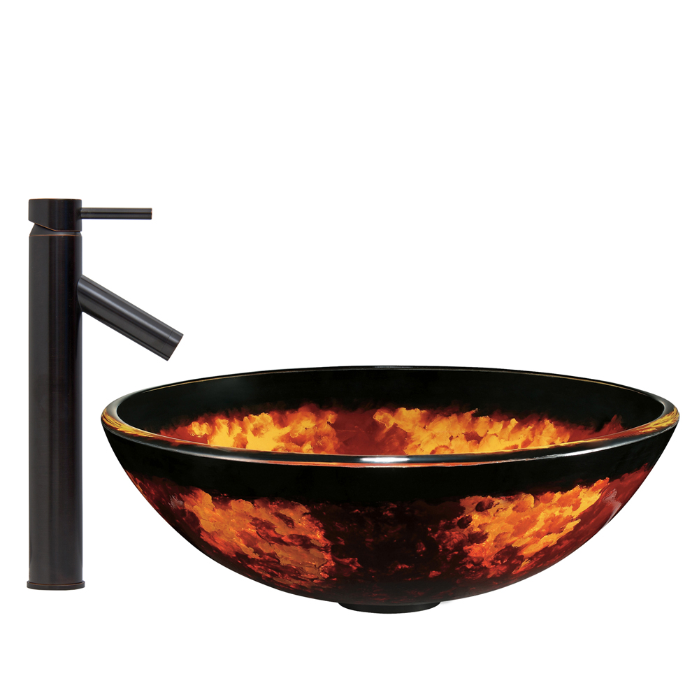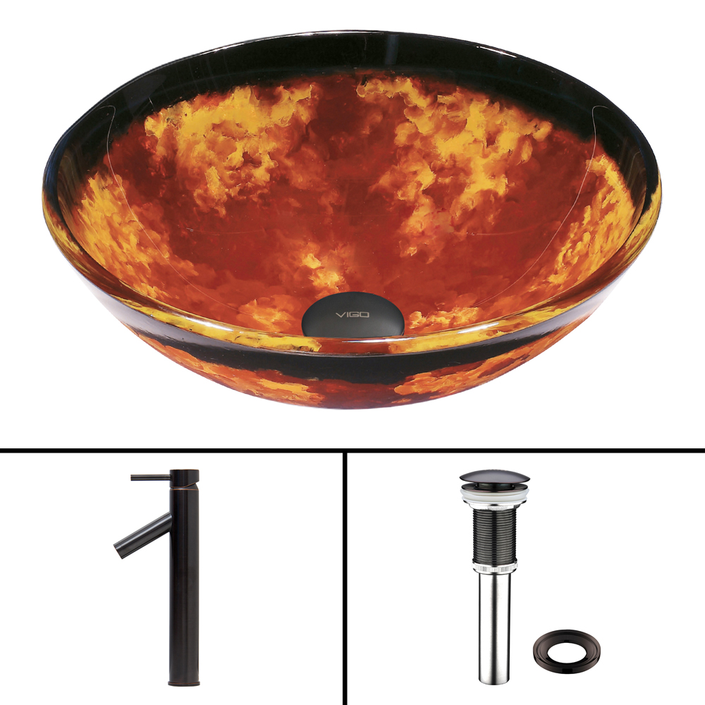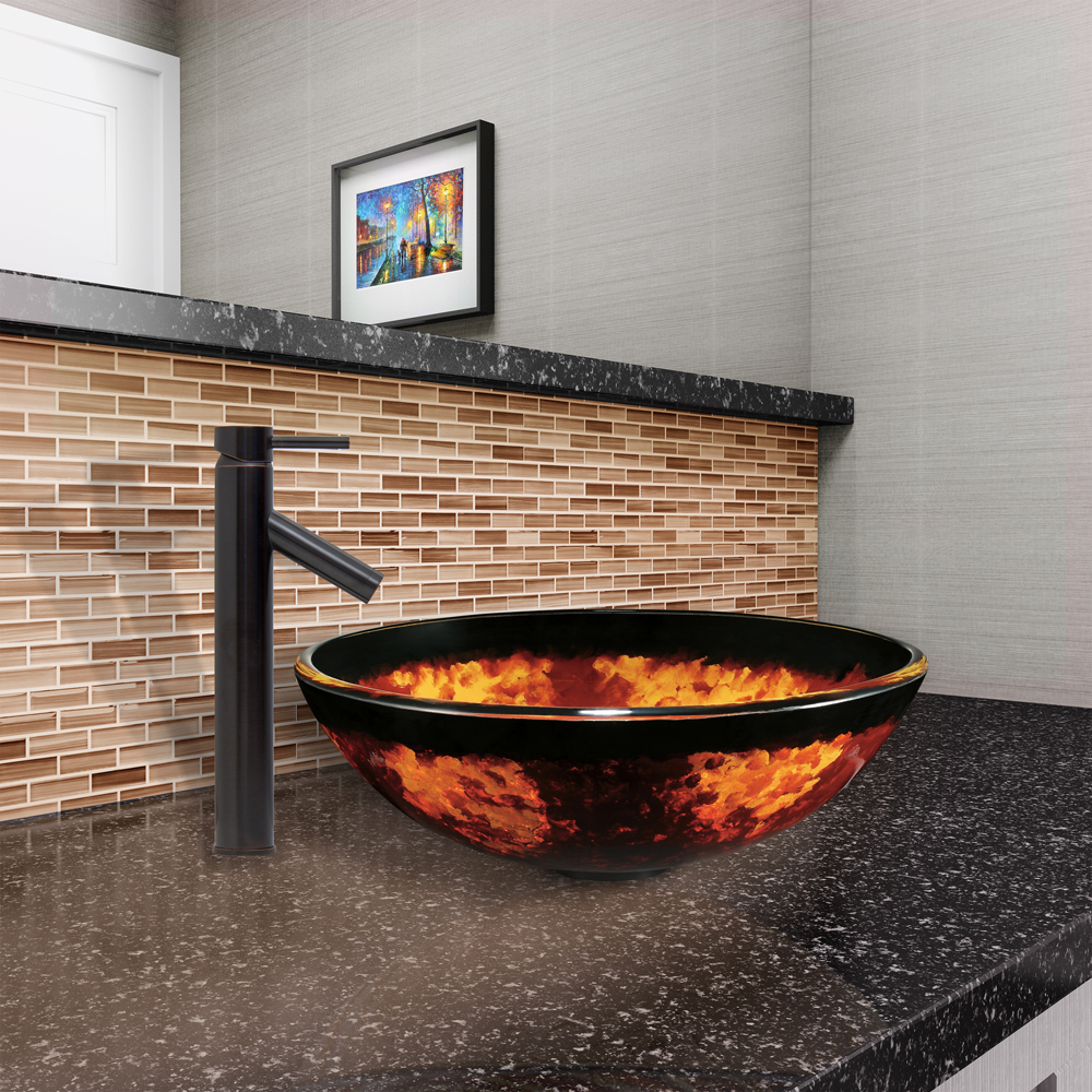 The VIGO Auburn/Mocha Fusion Glass Vessel Sink and Dior Faucet Set in Antique Rubbed Bronze Finish brings a unique and luxurious centerpiece to your bathroom.