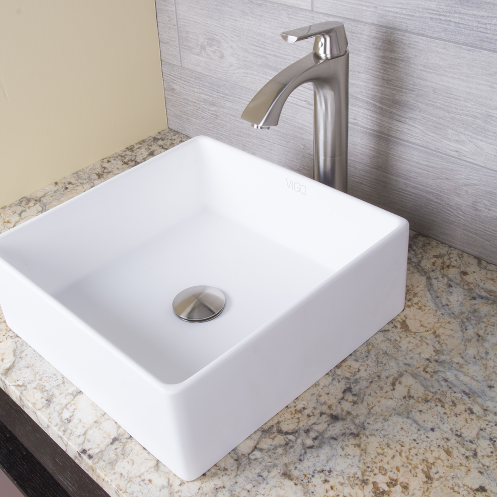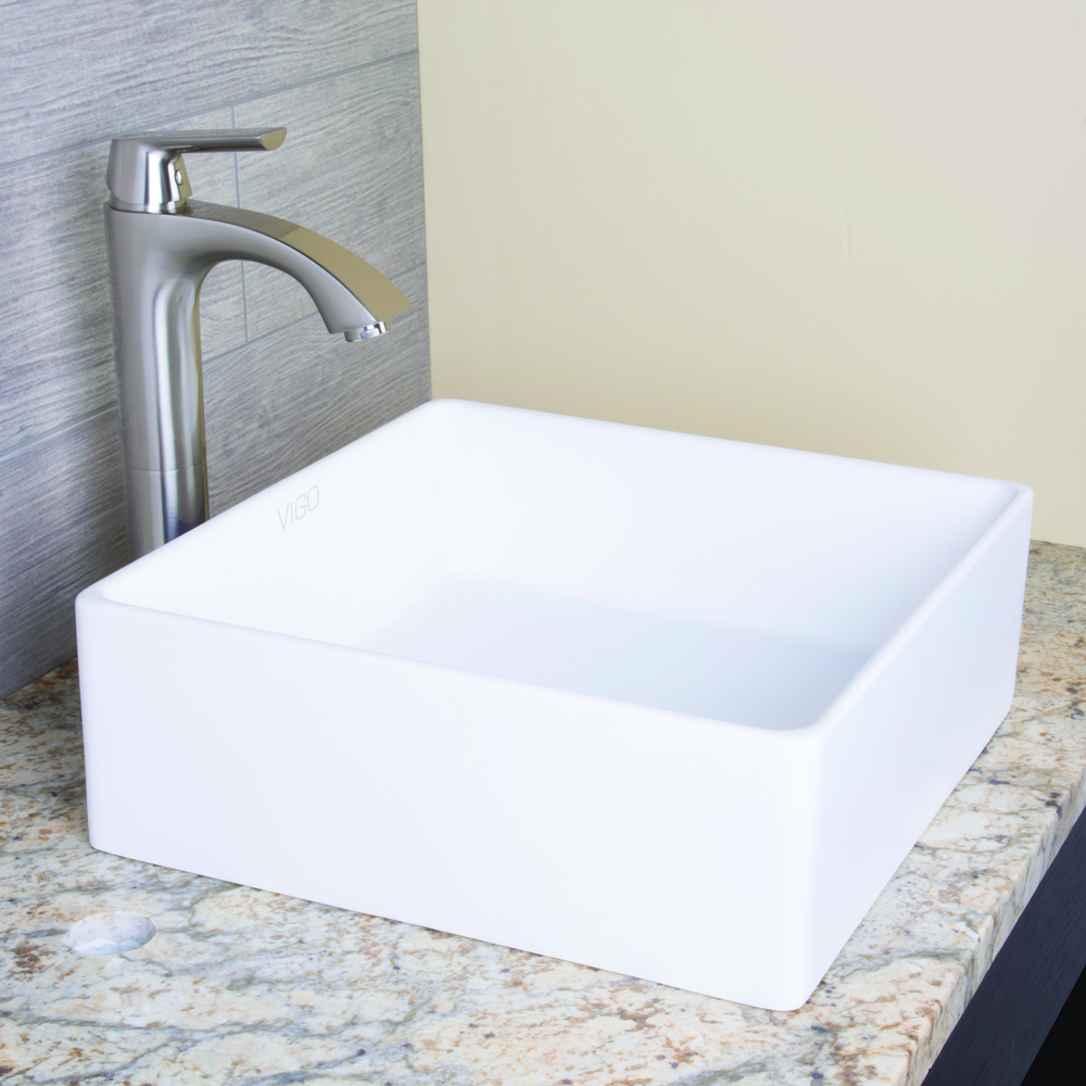 The square VG04001 Bavaro Matte Stone Vessel Sink has a luxuriously smooth, matte white surface