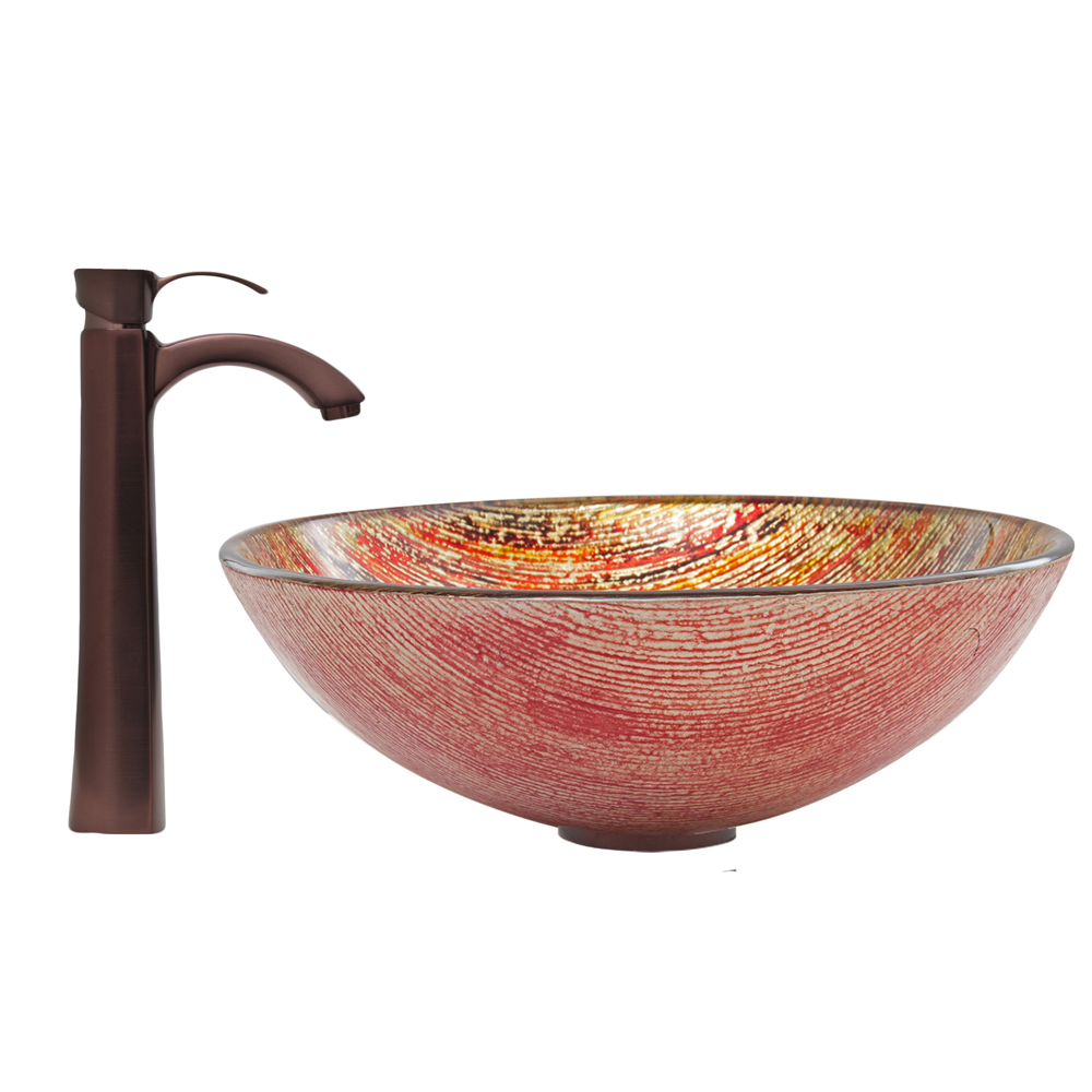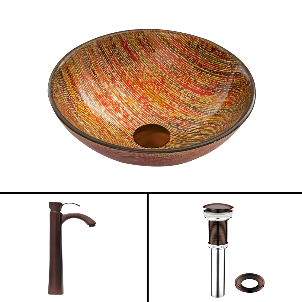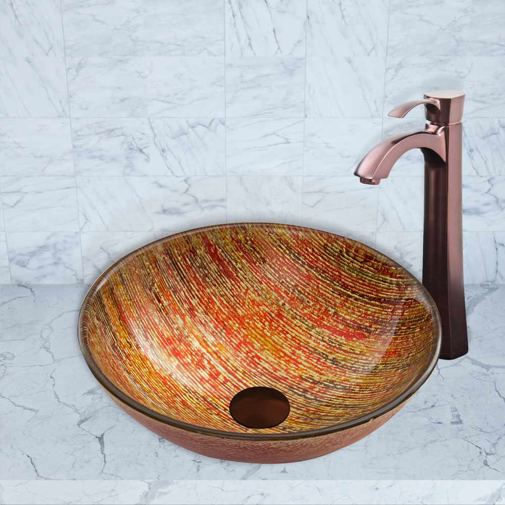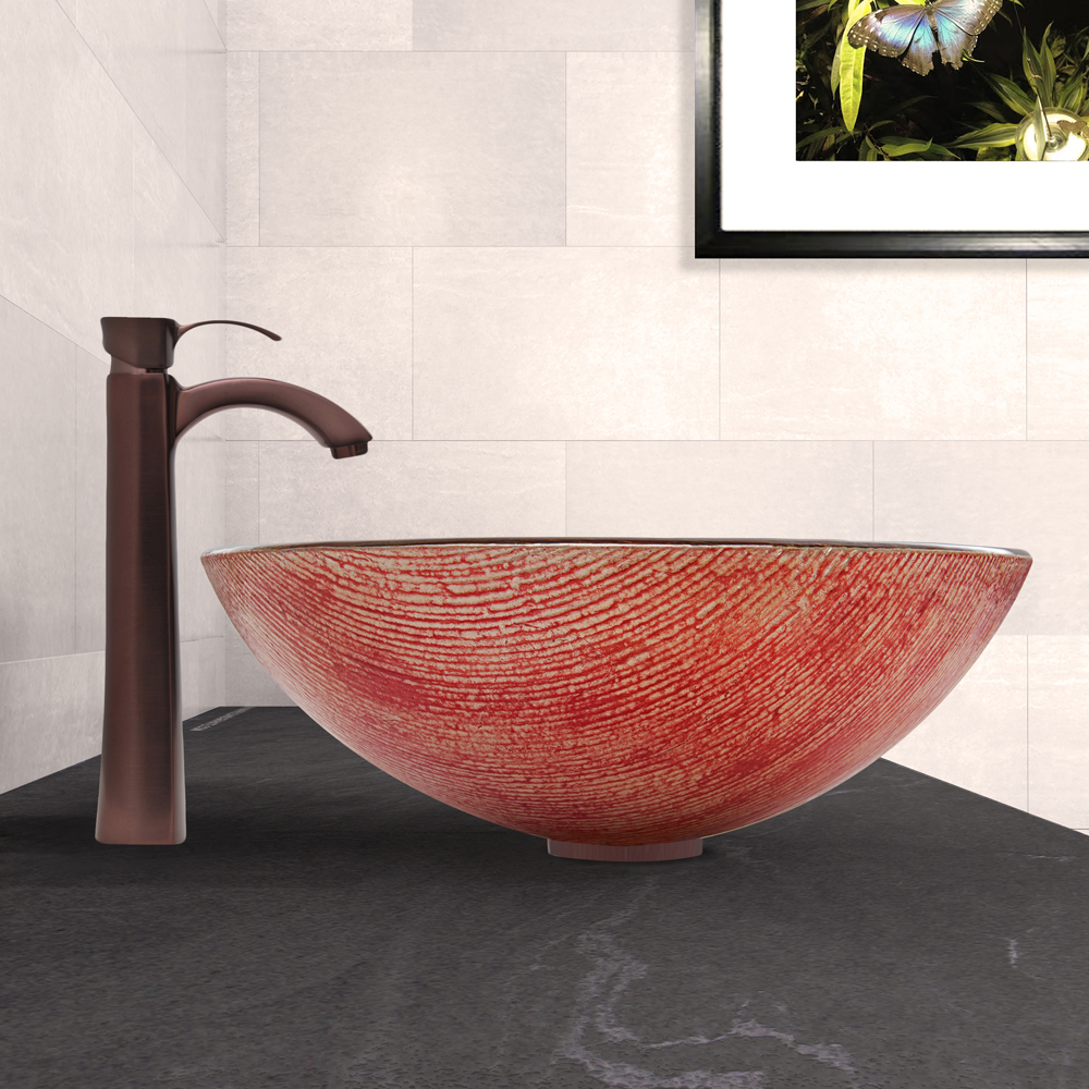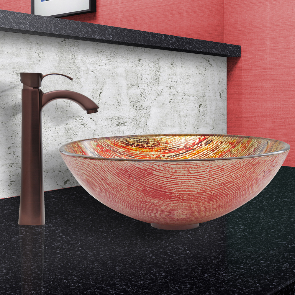 The VIGO Blazing Fire Glass Vessel Sink and Otis faucet set in Oil Rubbed Bronze features a single lever curved spout.