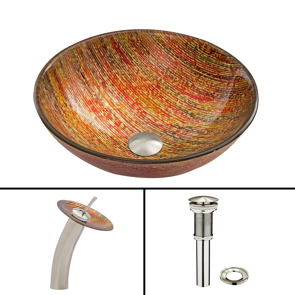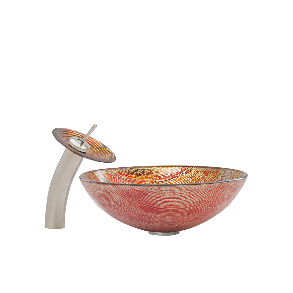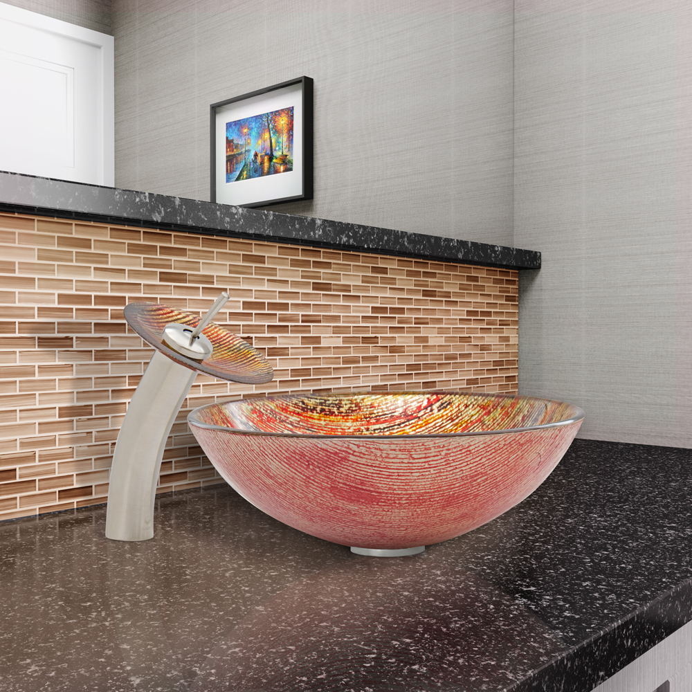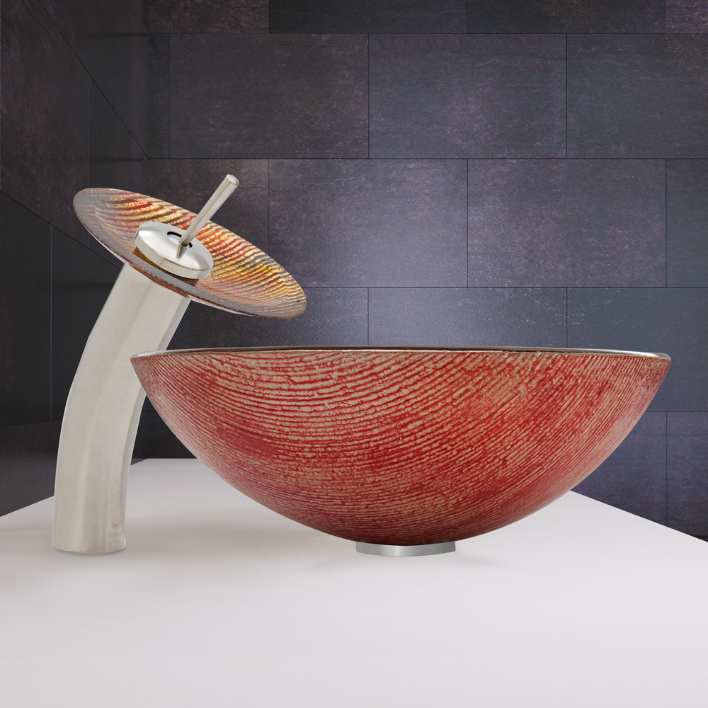 The VIGO Blazing Fire Glass Vessel Sink and Waterfall Faucet Set in Brushed Nickel Finish fulfills your burning desire to have the most impressive bathroom on the block.