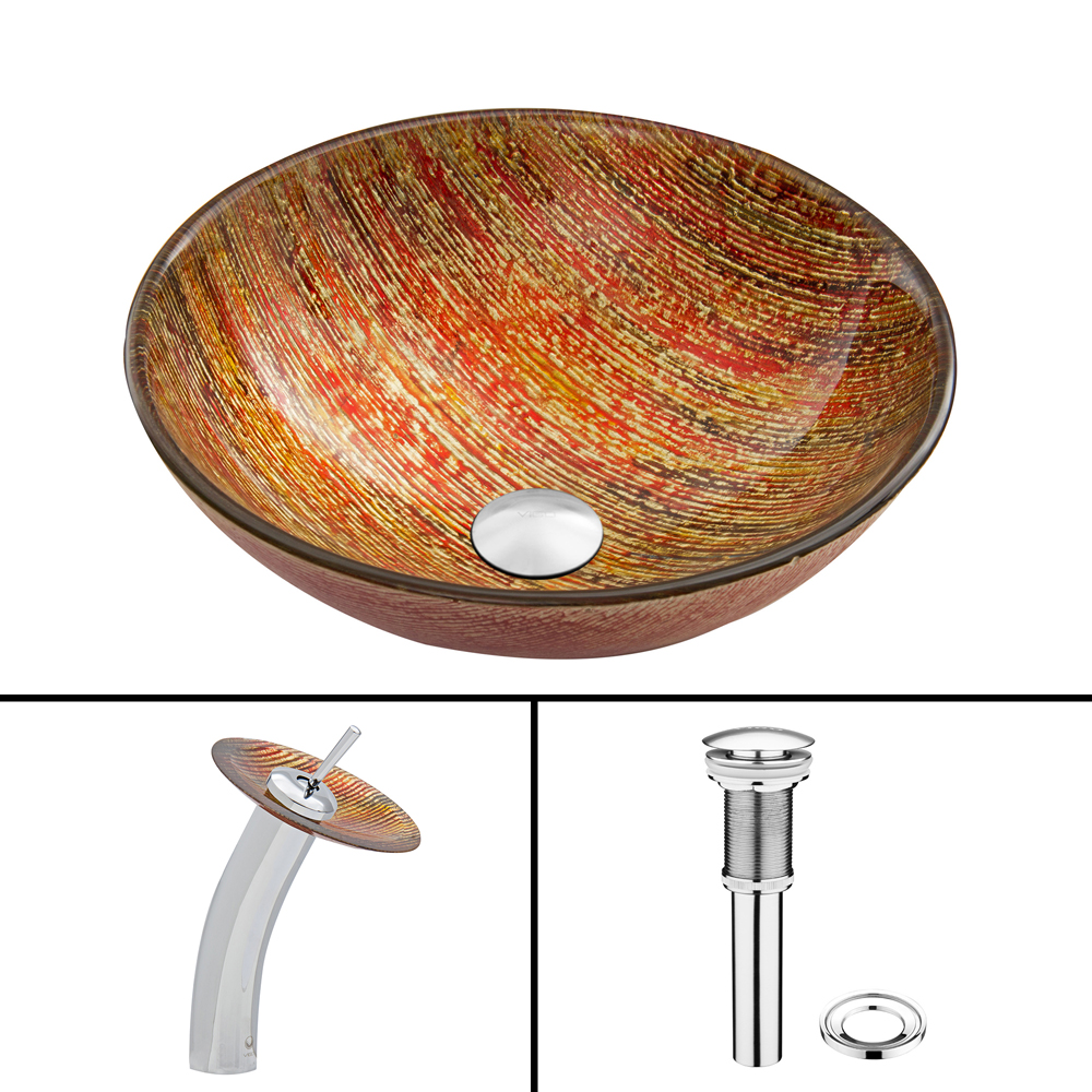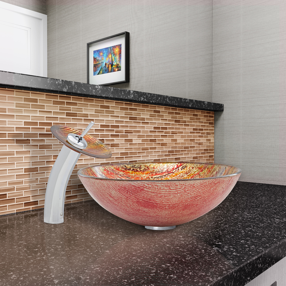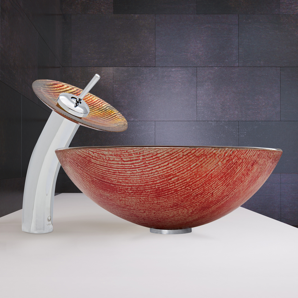 The VIGO Blazing Fire Glass Vessel Sink and Waterfall Faucet Set in Chrome Finish fulfills your burning desire to have the most impressive bathroom on the block.