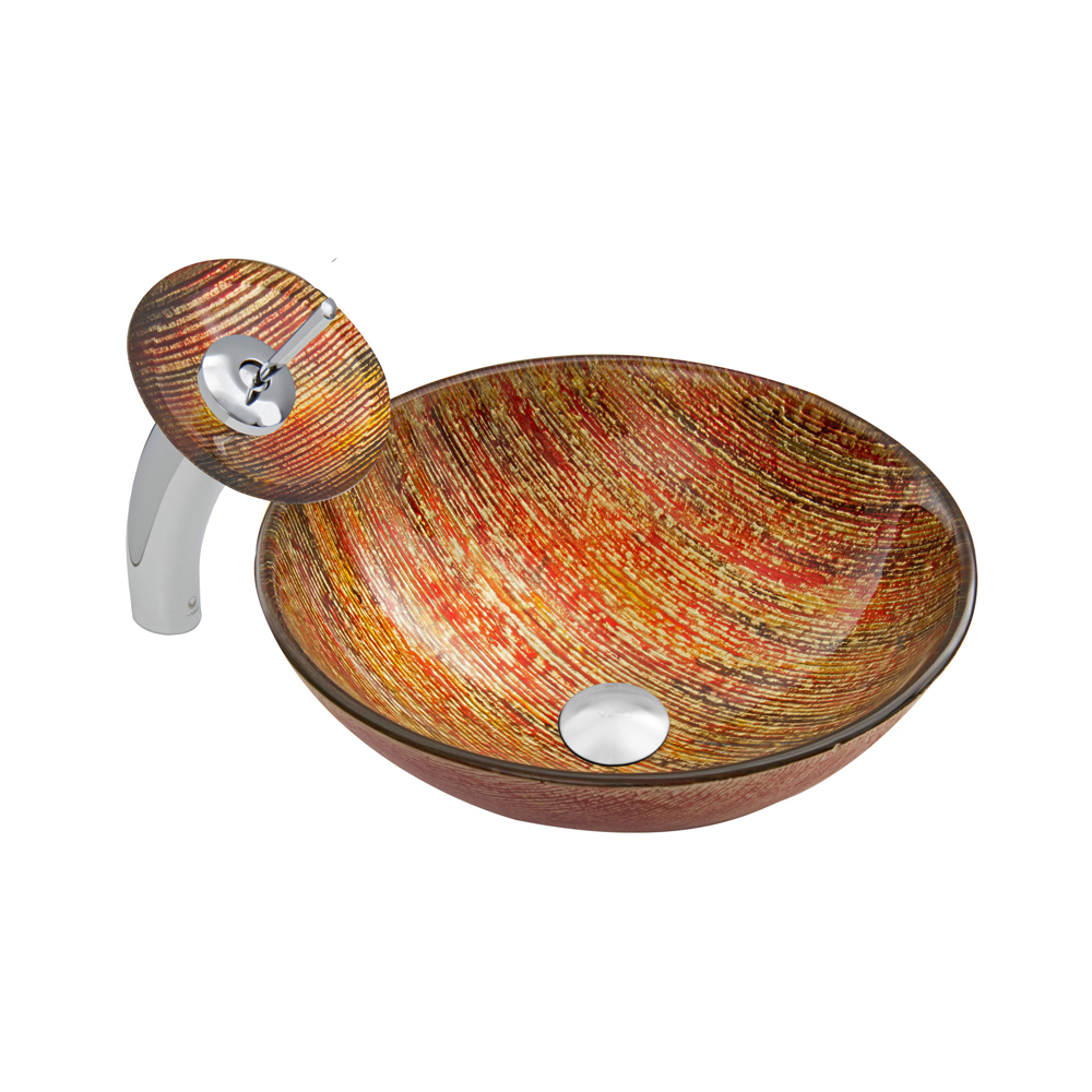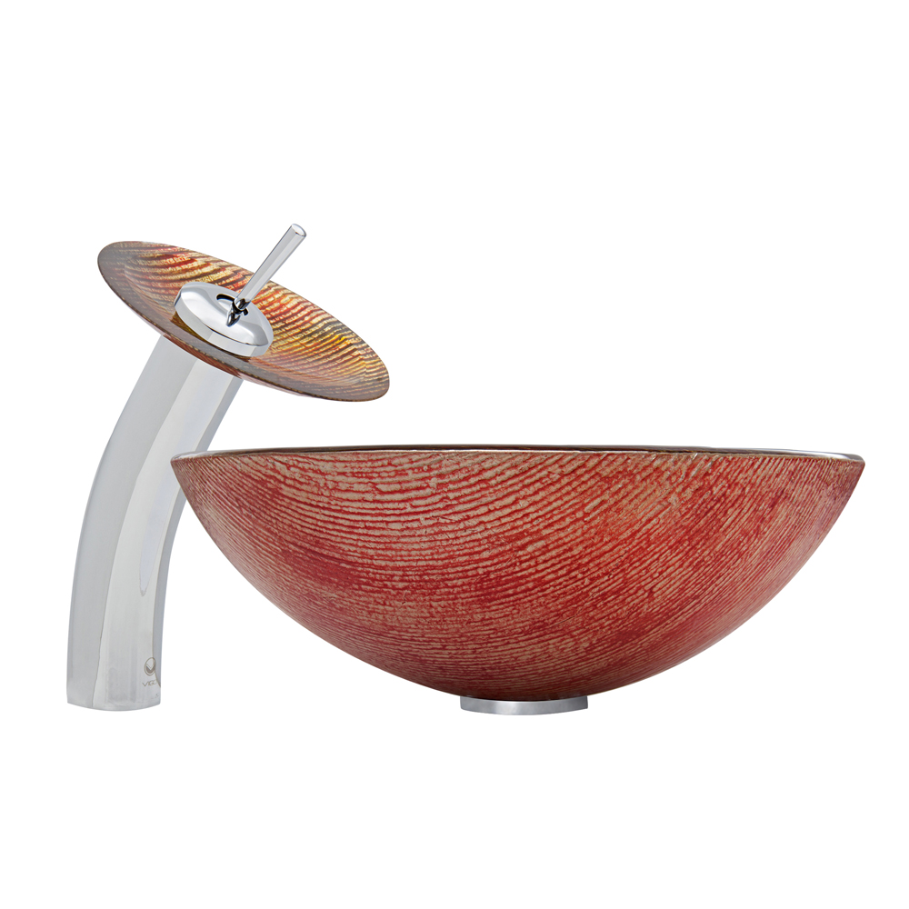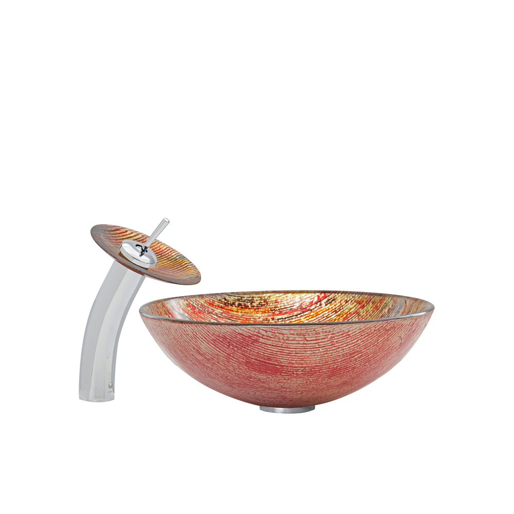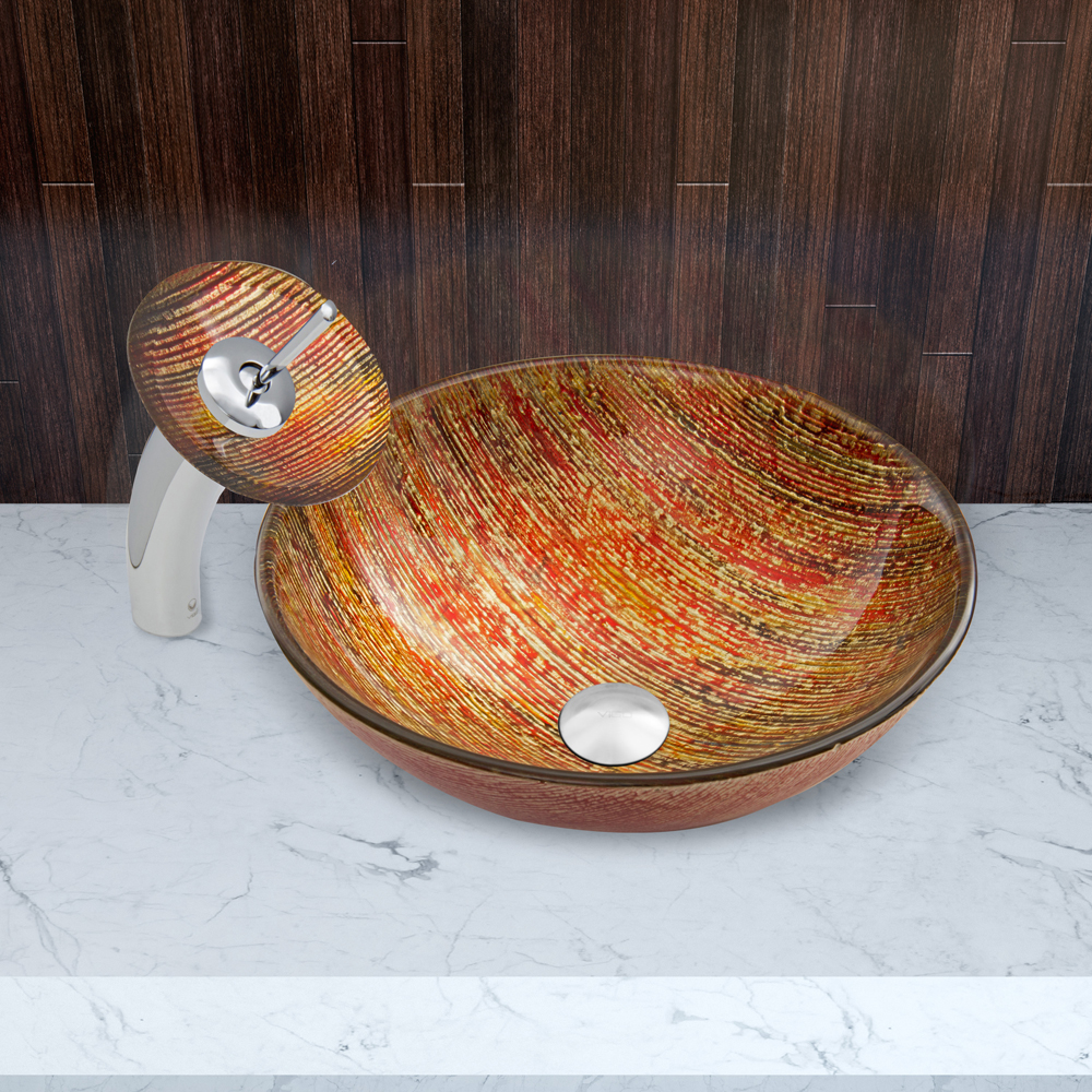 The VIGO Blazing Fire Glass Vessel Sink and Waterfall Faucet Set in Chrome Finish fulfills your burning desire to have the most impressive bathroom on the block.