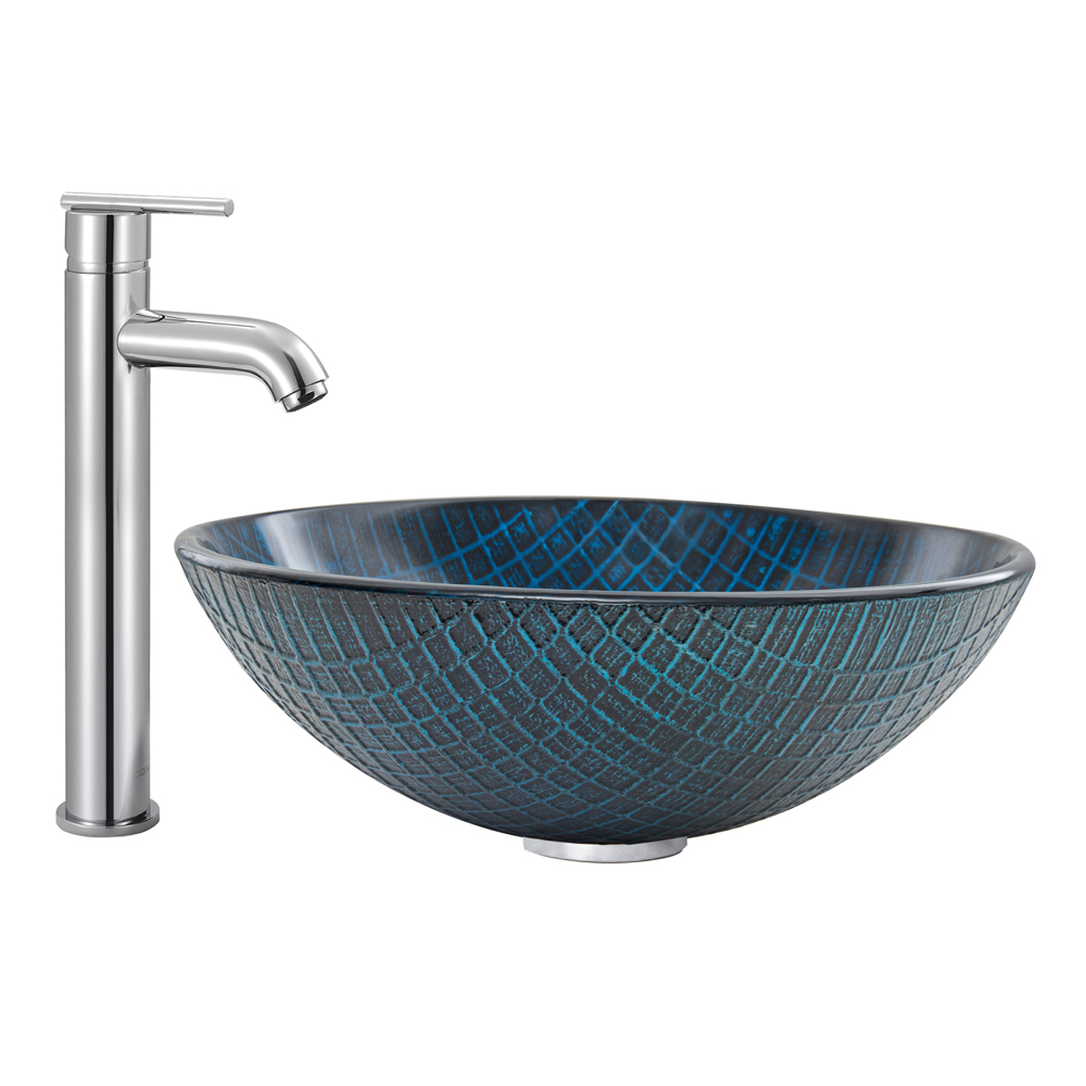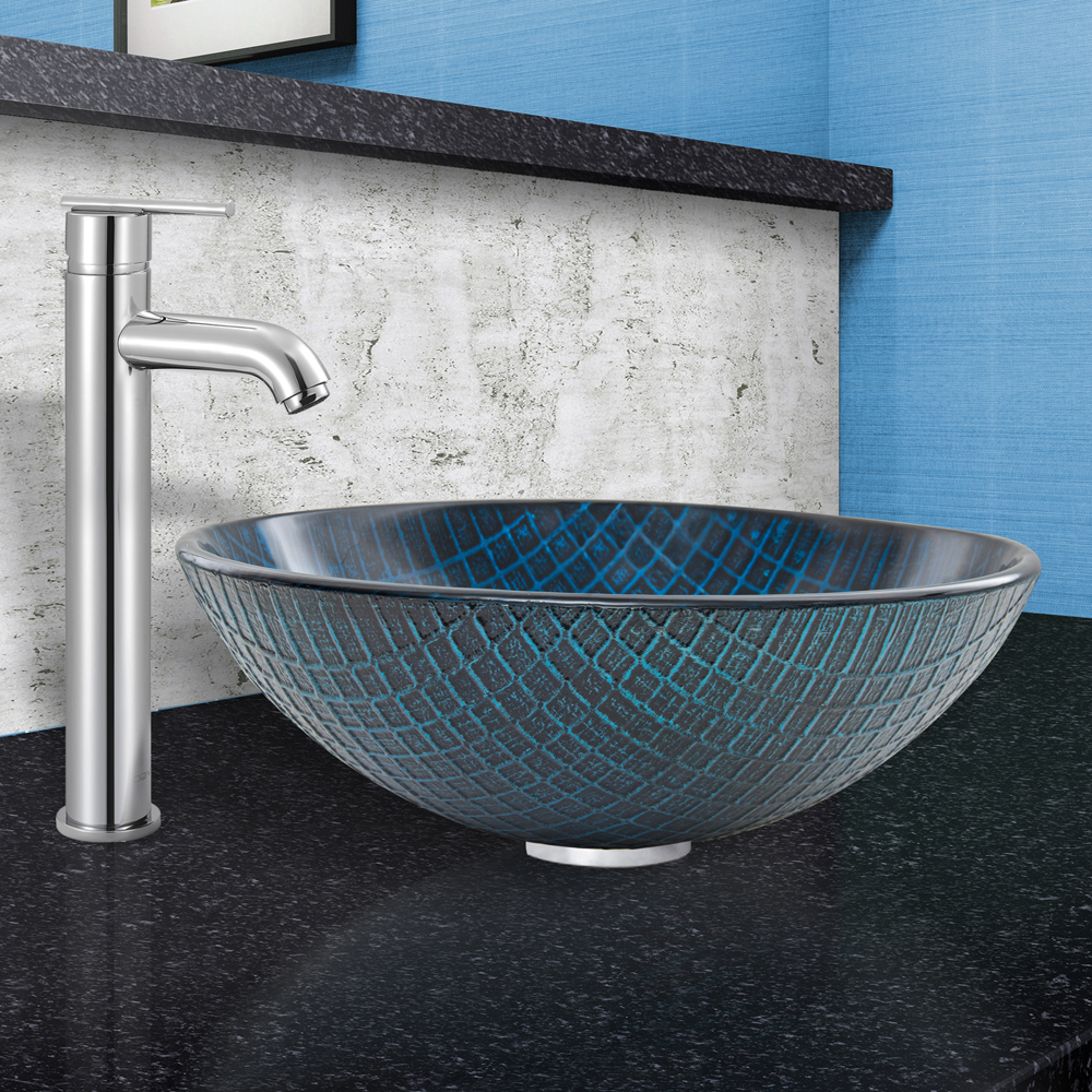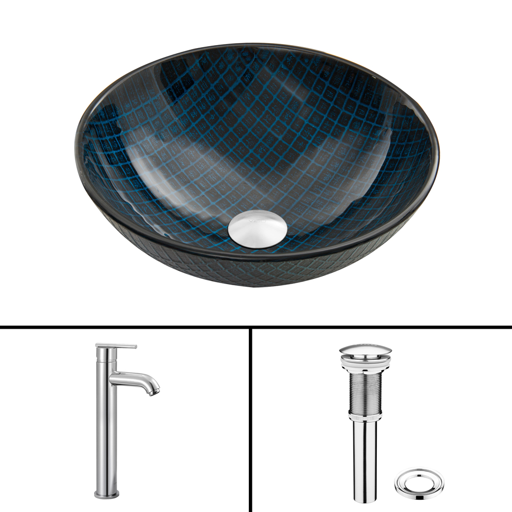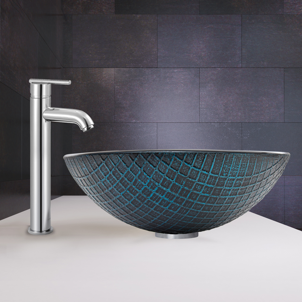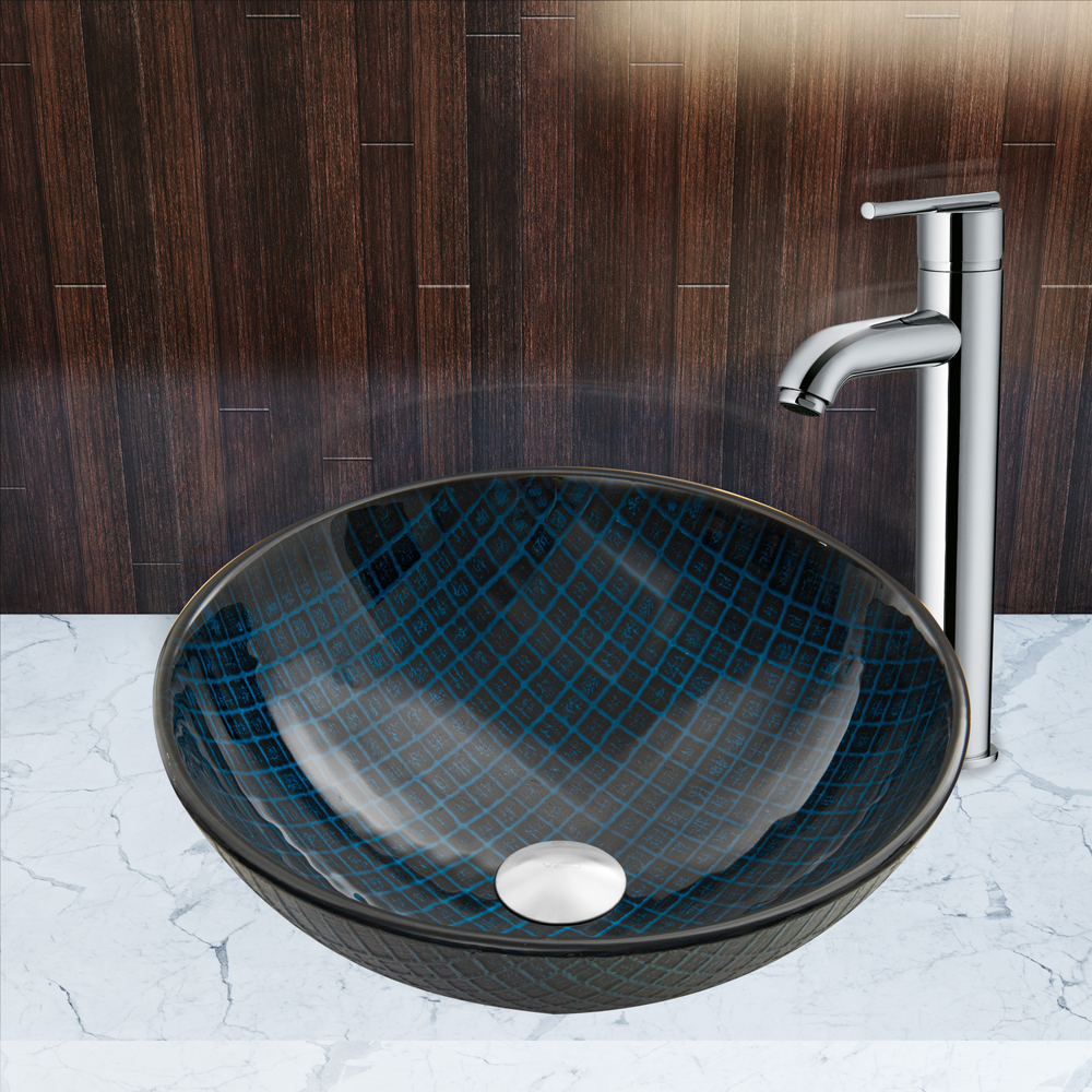 The VIGO Blue Matrix Glass Vessel Sink and Seville Faucet Set in Chrome Finish will update your bathroom into a space of the future.