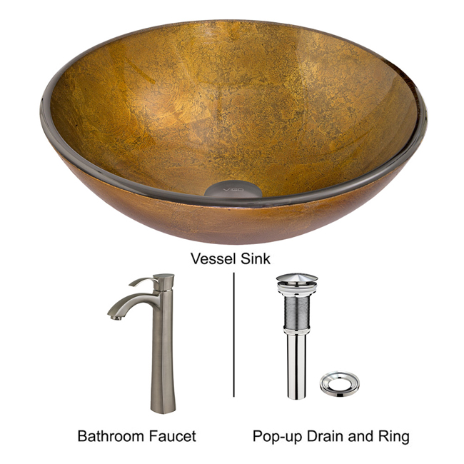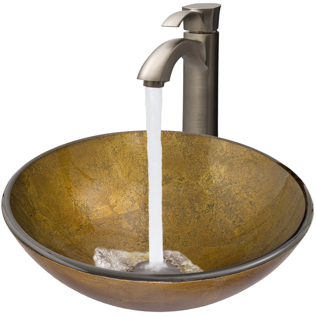The VIGO Branco glass vessel sink and Otis faucet set in Brushed Nickel is a modern and sophisticated addition to the bathroom.