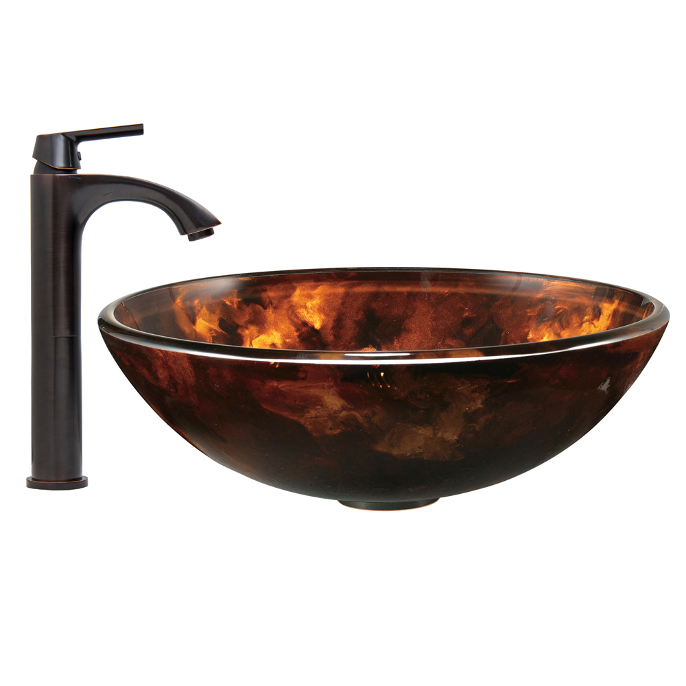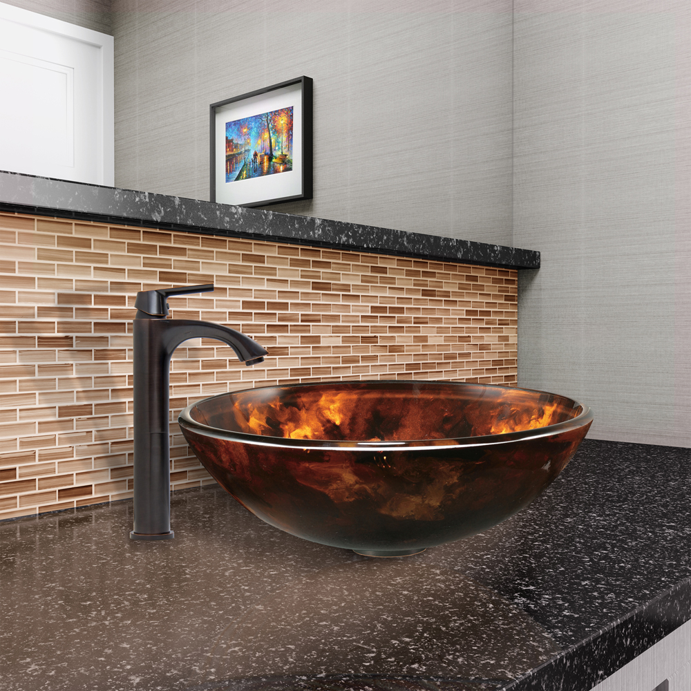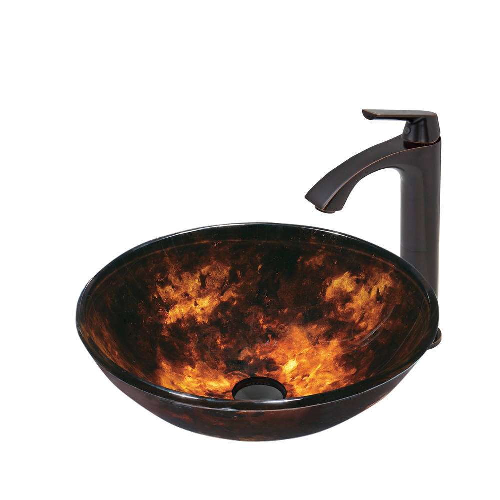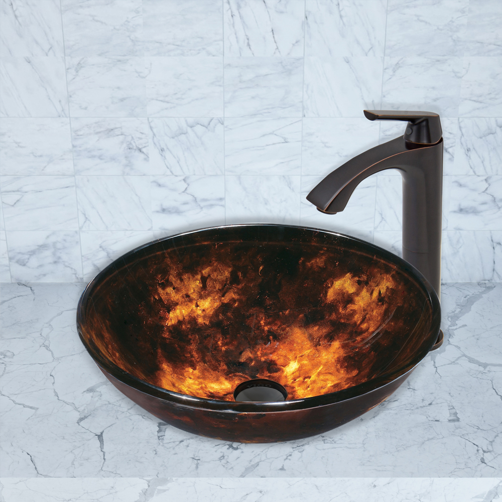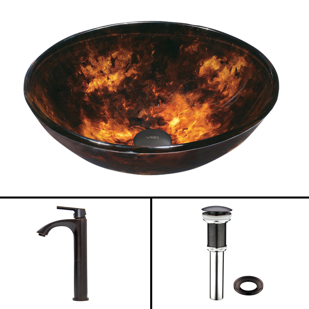 The VIGO Brown and Gold Fusion Glass Vessel Sink and Linus Faucet Set in Antique Rubbed Bronze Finish will bring your bathroom a luxurious and rustic appearance