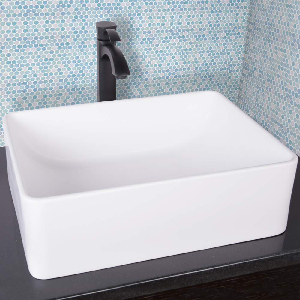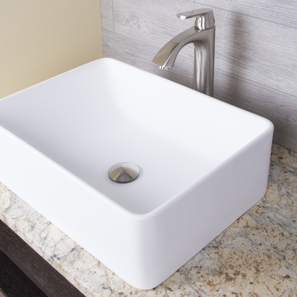 The rectangular VG04005 Caladesi Matte Stone Vessel Sink has a luxuriously smooth, matte white surface