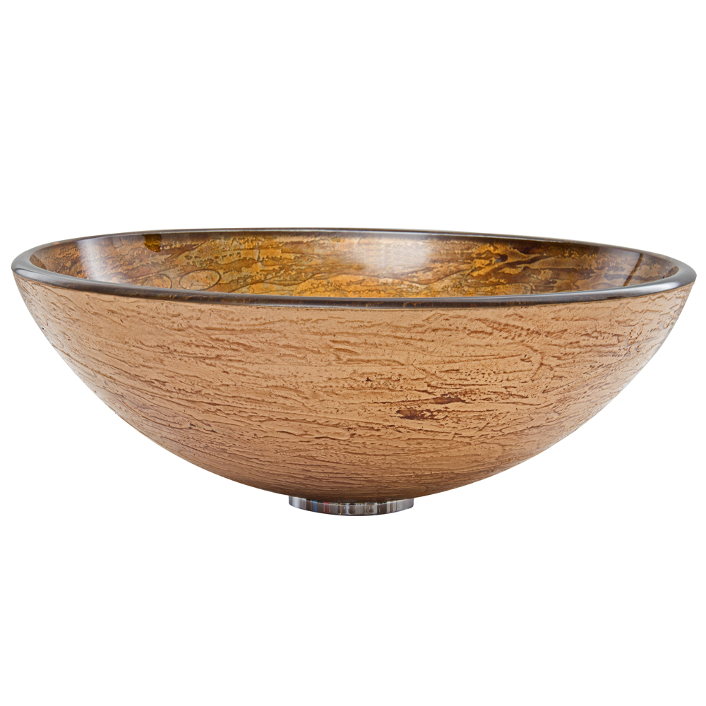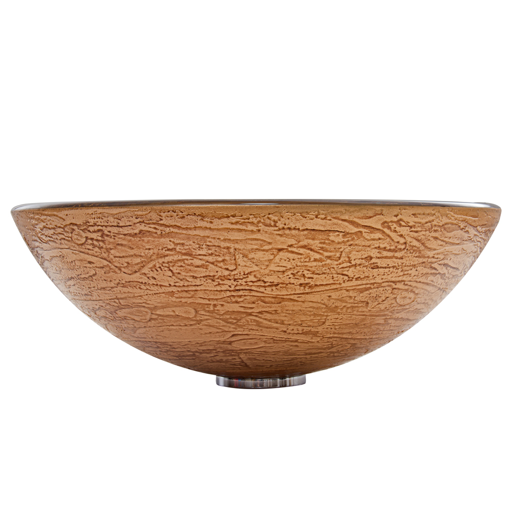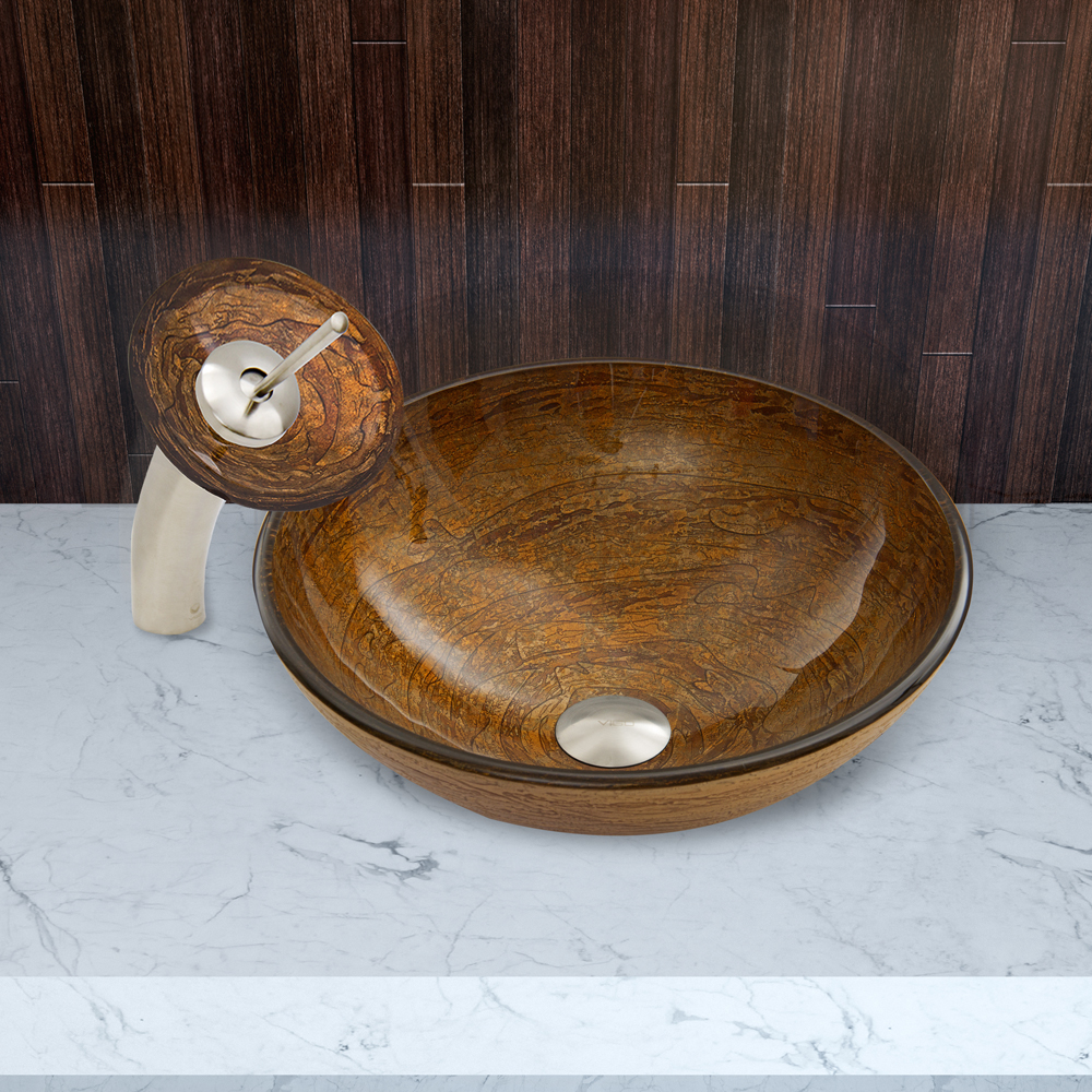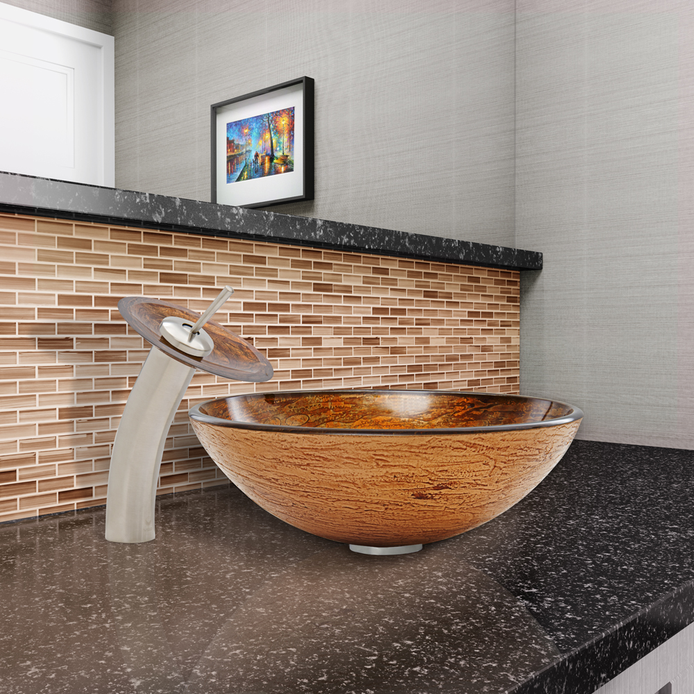 The VG07058 Cappuccino Swirl glass vessel sink features swirls of browns and golds, making it a tasteful addition to any bathroom.