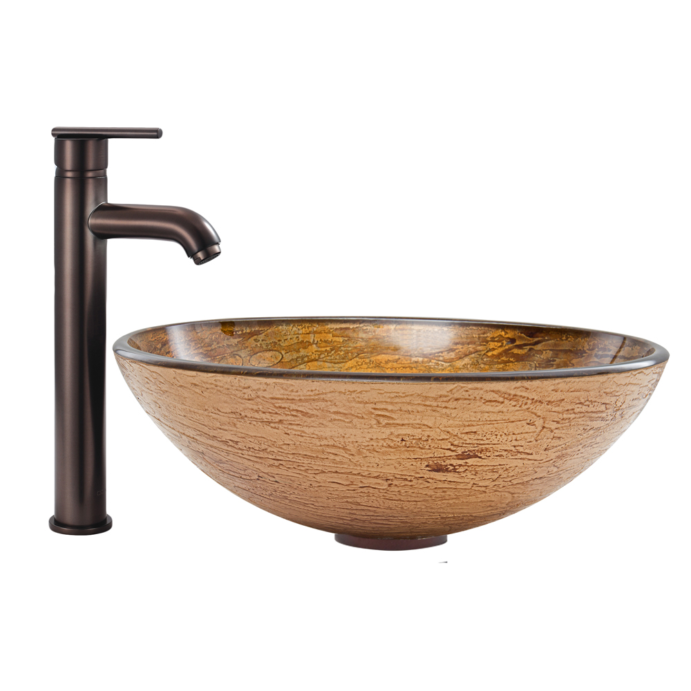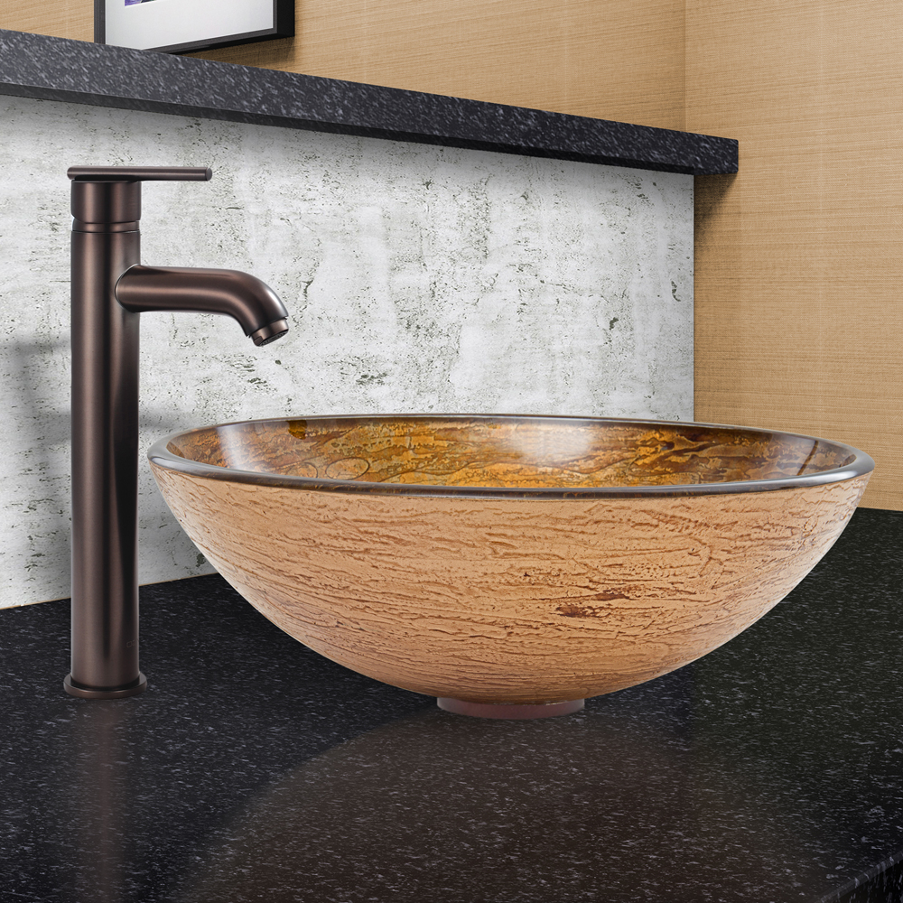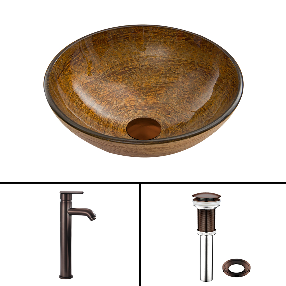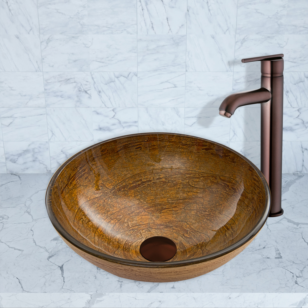 The VIGO Cappuccino Swirl Glass Vessel Sink and Seville Faucet Set in Oil Rubbed Bronze Finish will create a clean and modern, yet smooth and sleek addition to your bathroom.