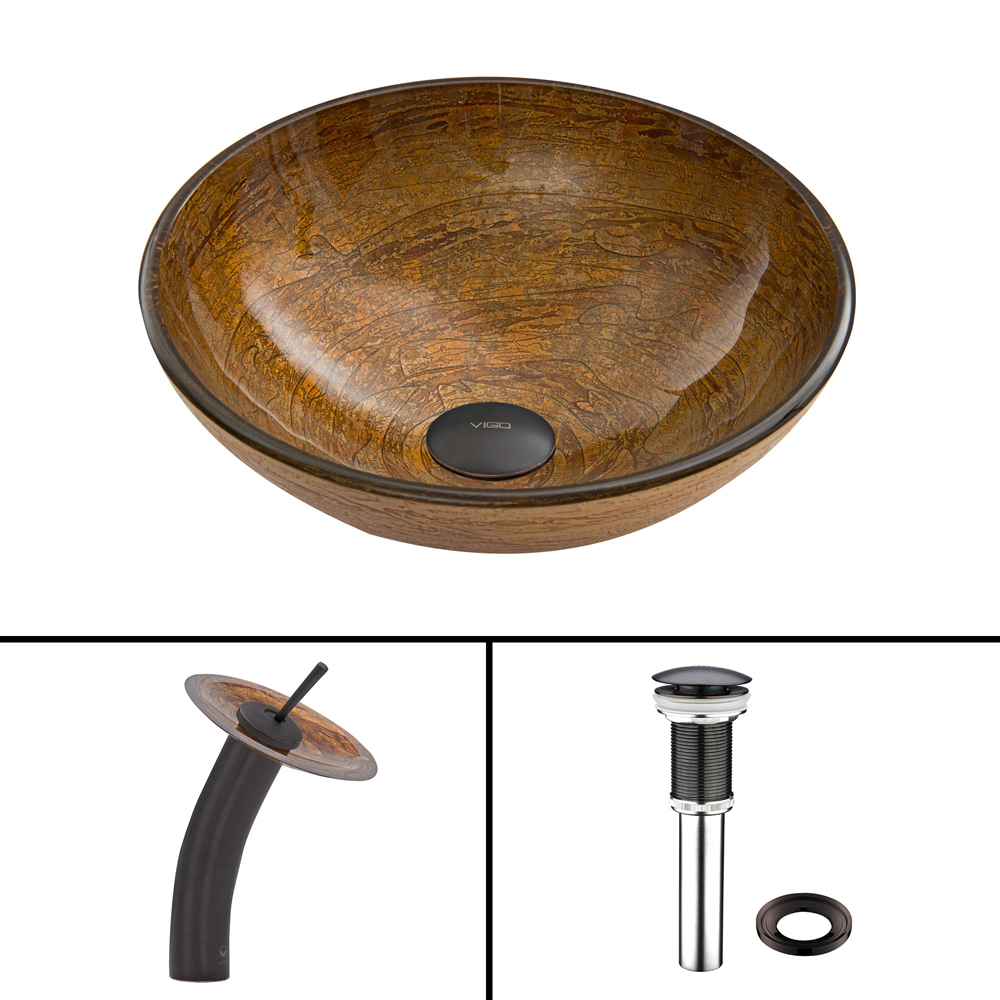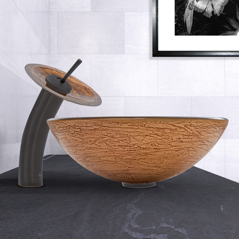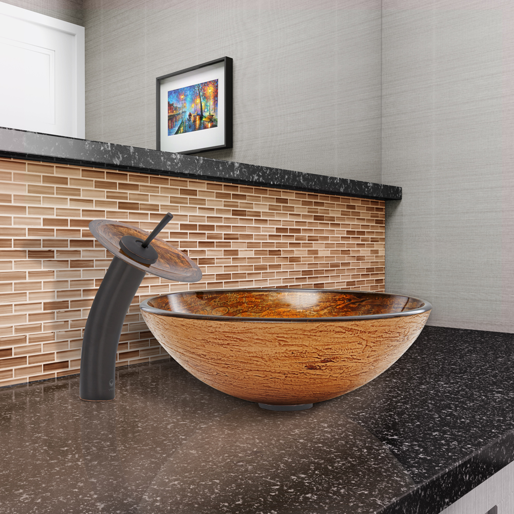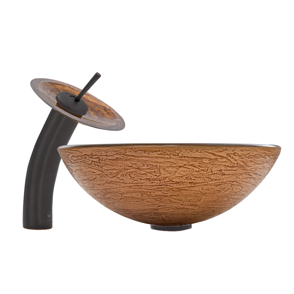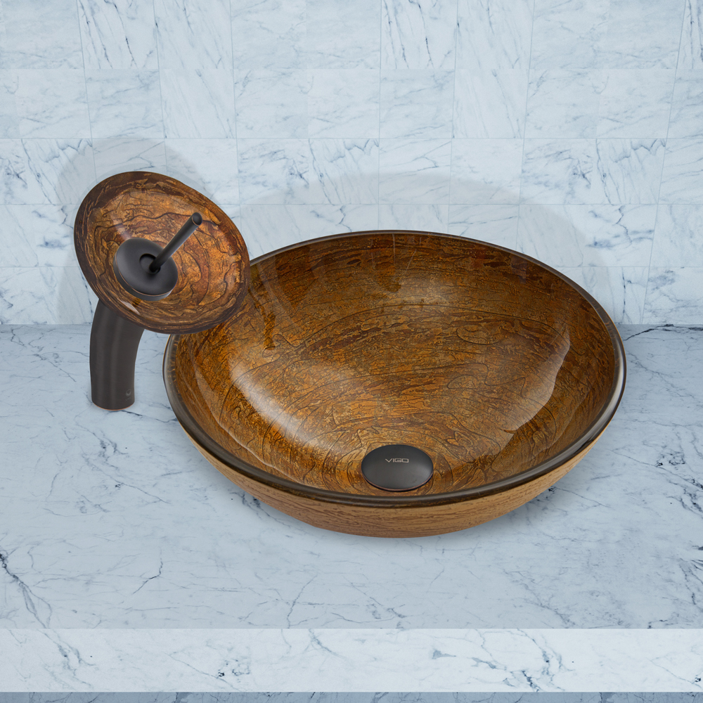 Wake up in the morning with the VIGO Cappuccino Swirl vessel sink and matching waterfall faucet in antique rubbed bronze in your bathroom. The creamy coffee colors resemble the coffee and froth of a delicious cappuccino.