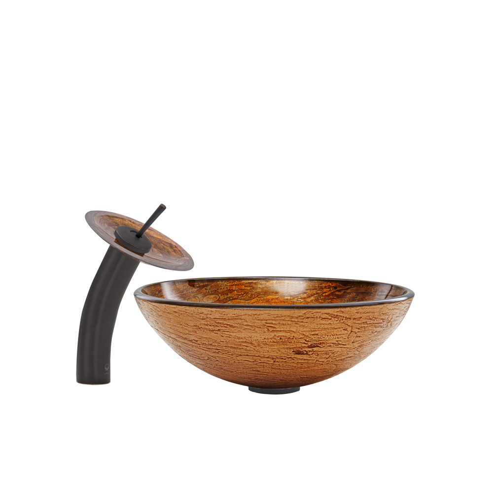 The VIGO Cappuccino Swirl Glass Vessel Sink and Waterfall Faucet Set in Antique Rubbed Bronze Finish will awaken your décor with smooth and stylish design.