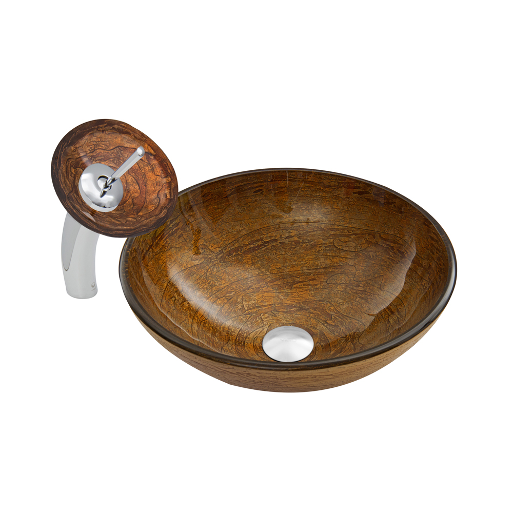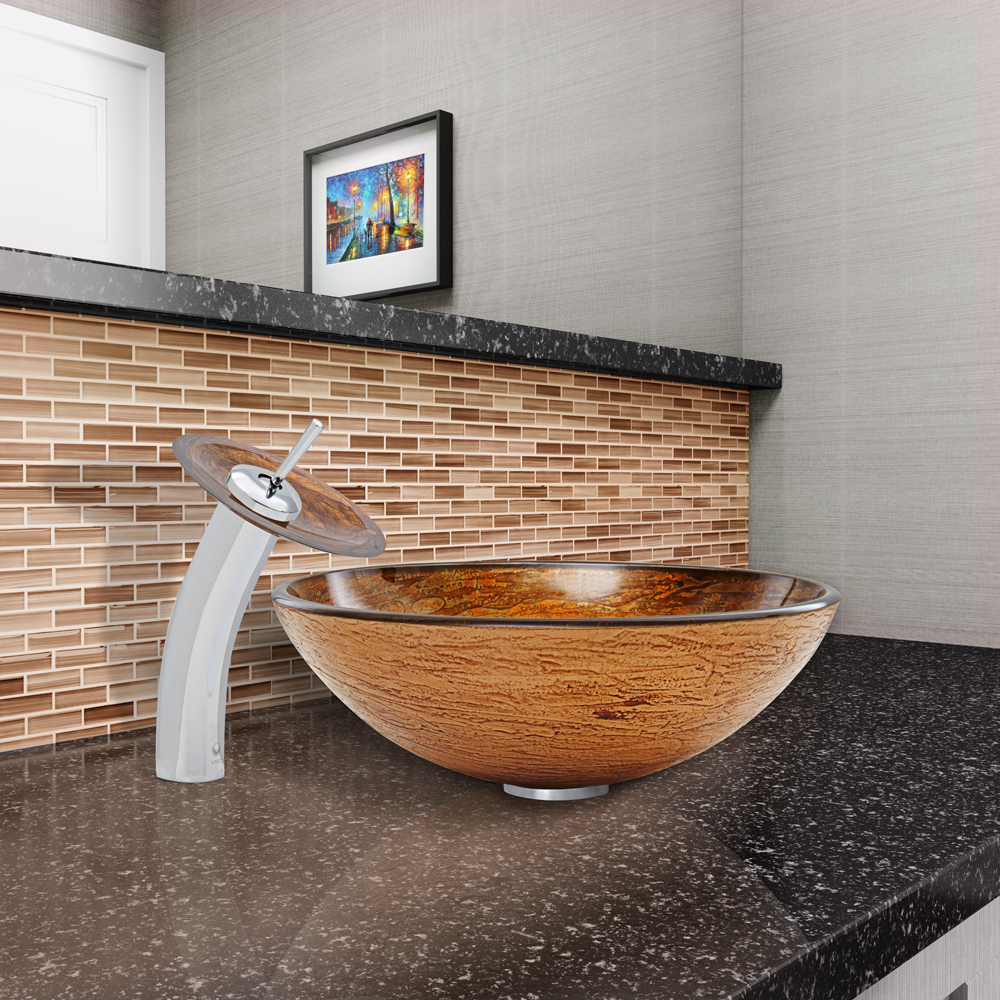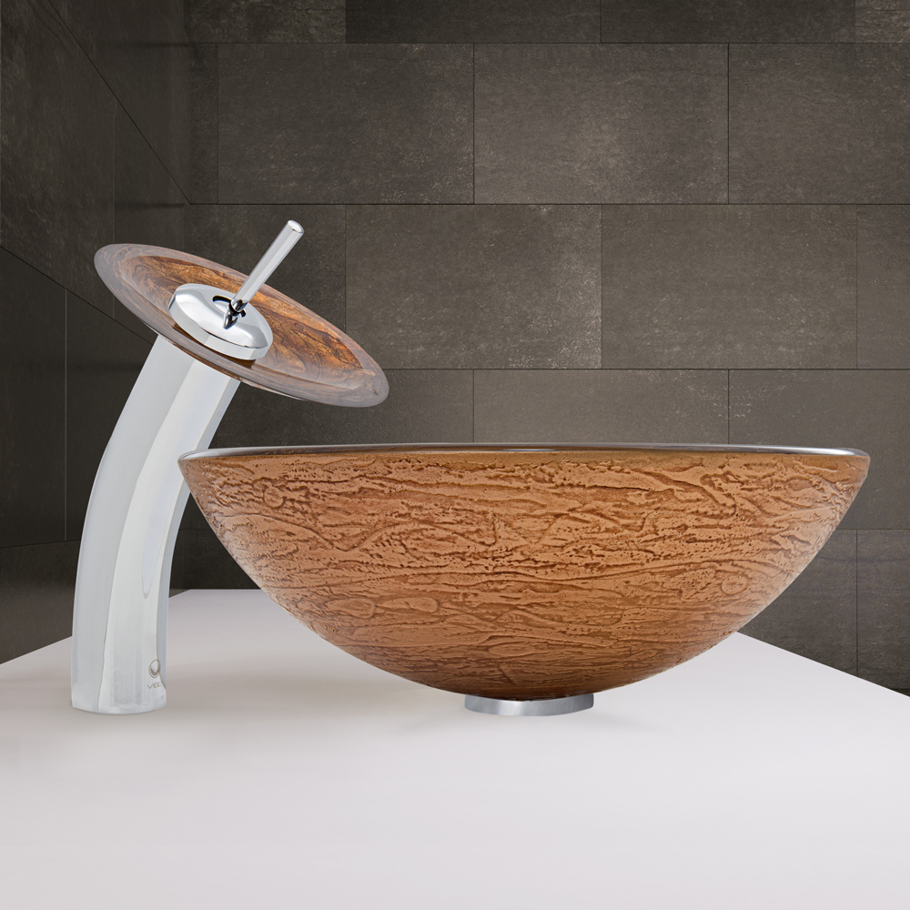 Wake up in the morning with the VIGO Cappuccino Swirl vessel sink and matching waterfall faucet in chrome in your bathroom. The creamy coffee colors resemble the coffee and froth of a delicious cappuccino.