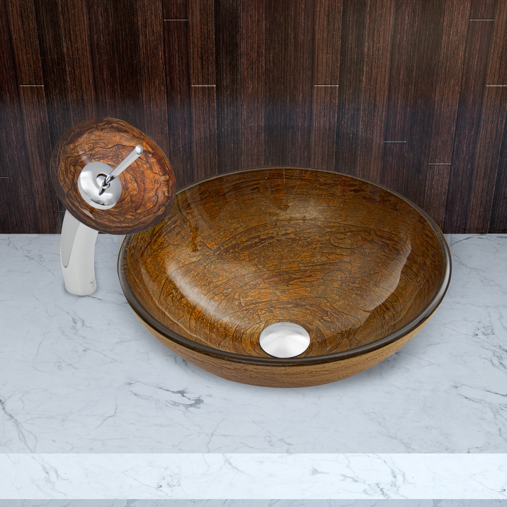 The VG07058 Cappuccino Swirl glass vessel sink features swirls of browns and golds, making it a tasteful addition to any bathroom.