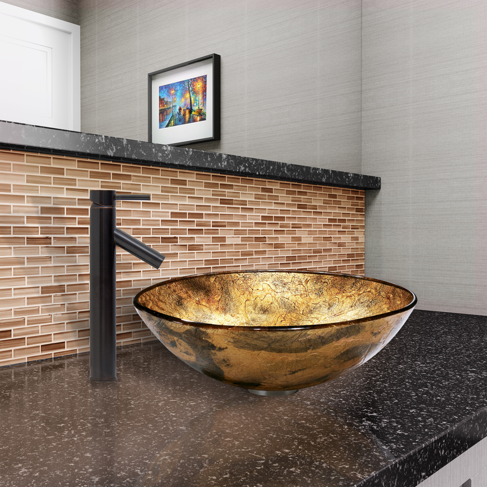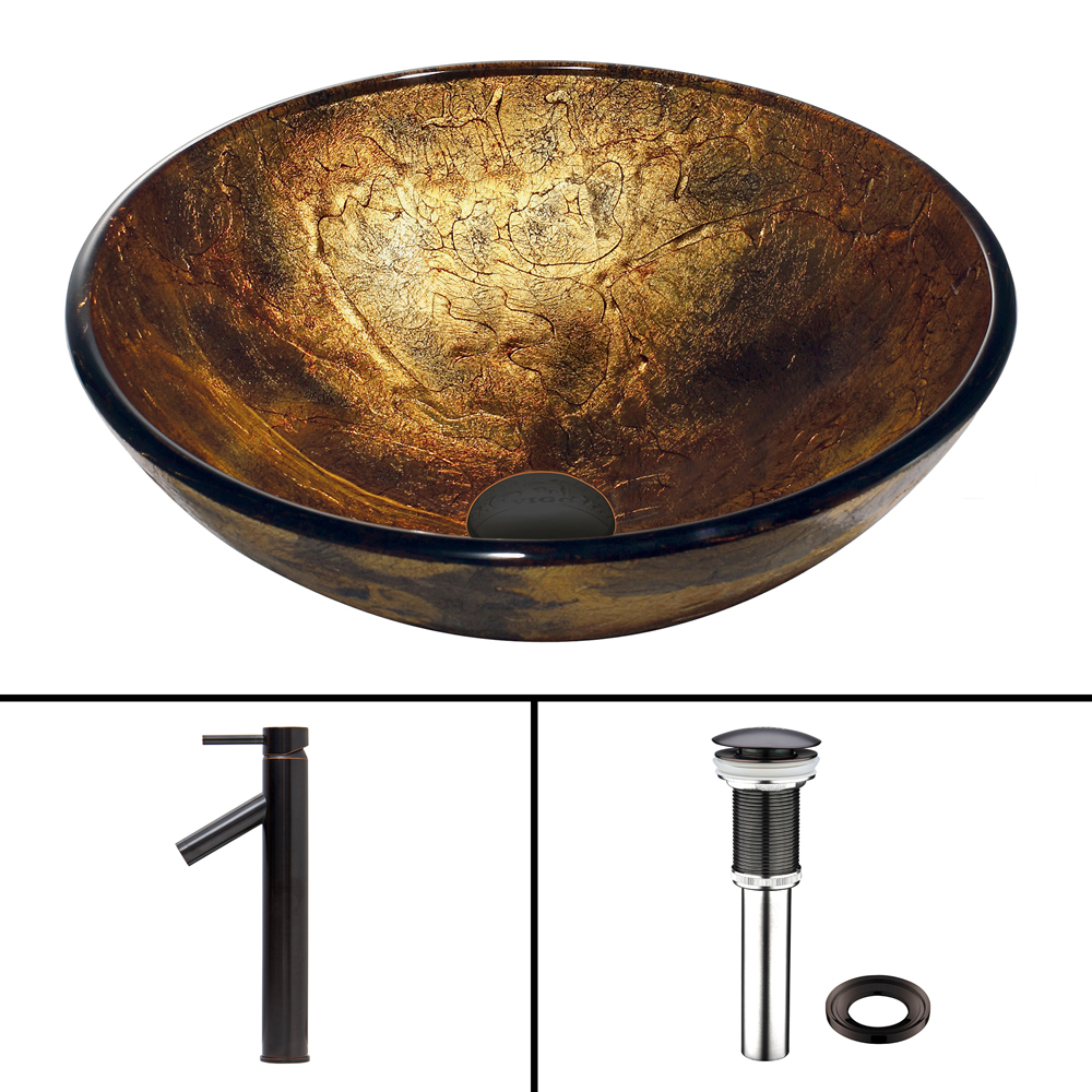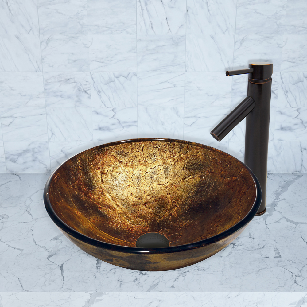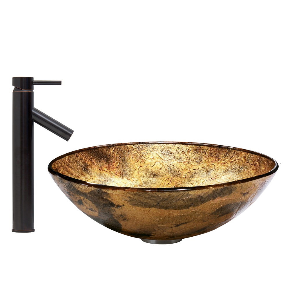 The VIGO Copper Shapes Glass Vessel Sink and Dior Faucet Set in Antique Rubbed Bronze Finish combines the elements of luxurious design with modern day style.