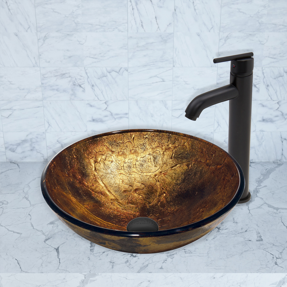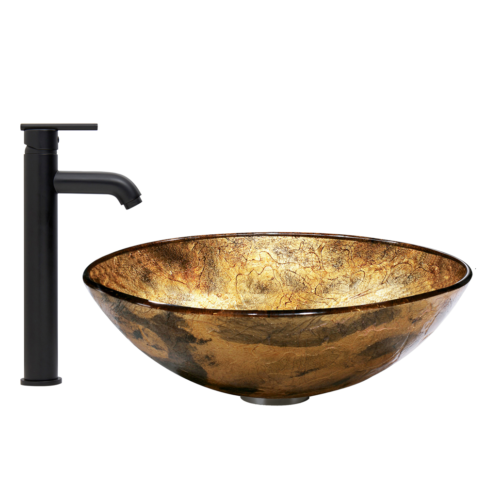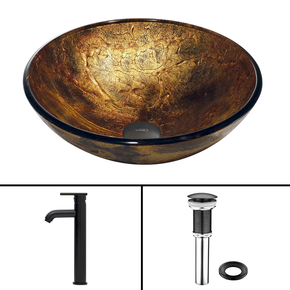 The VIGO Copper Shapes Glass Vessel Sink and Seville Faucet Set in Matte Black Finish brings luxury and modern style to your home.