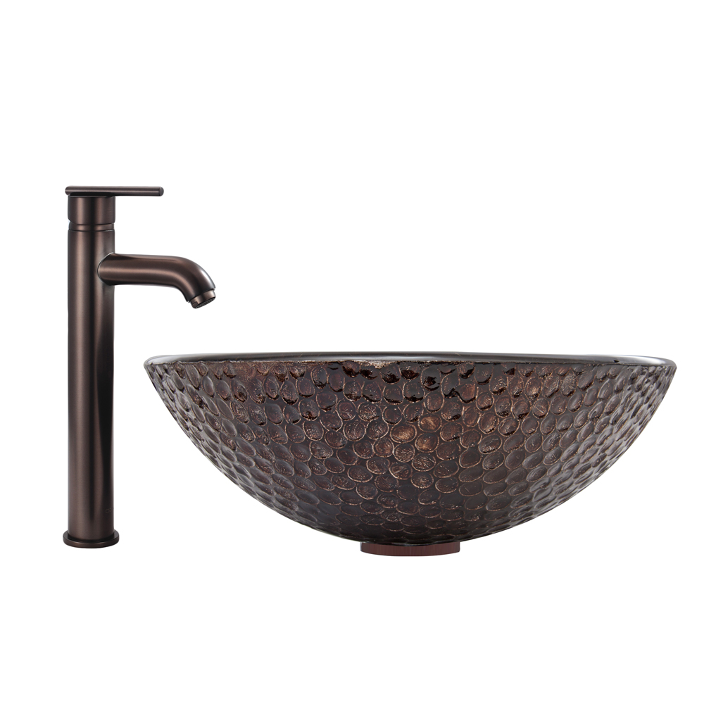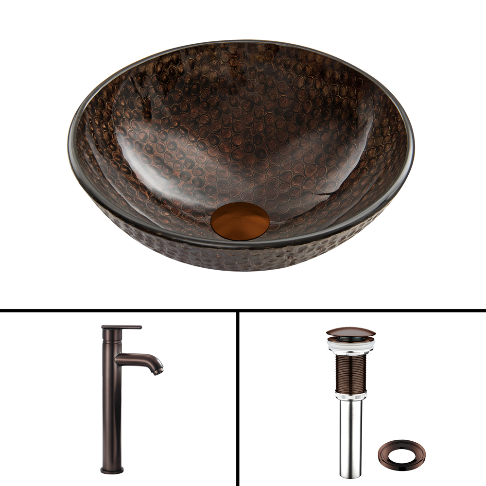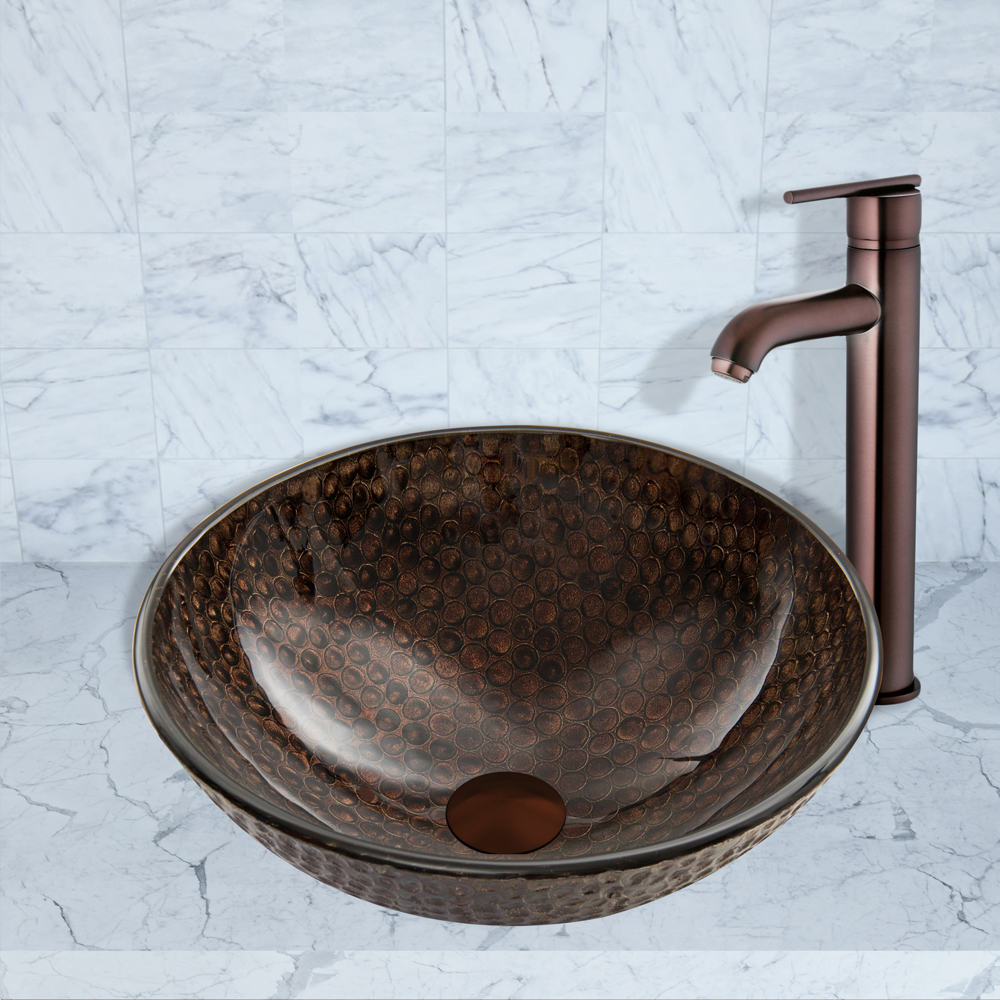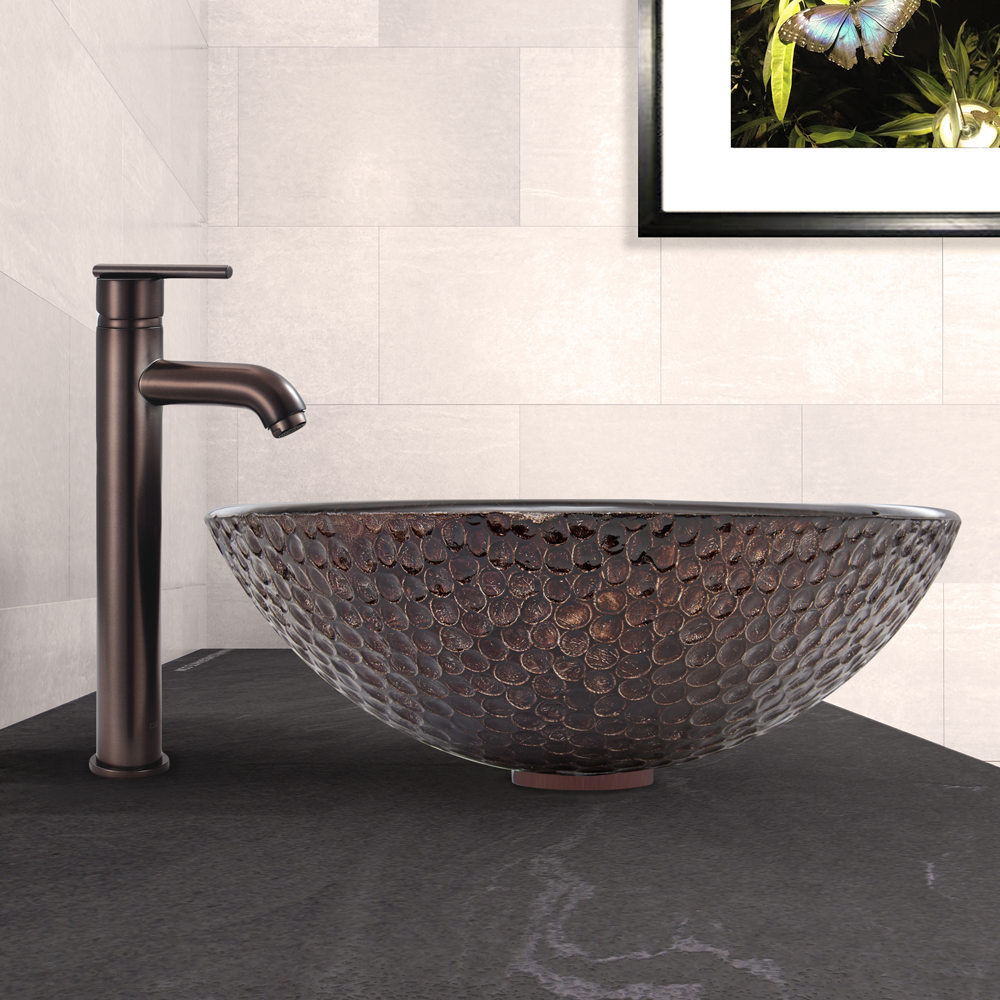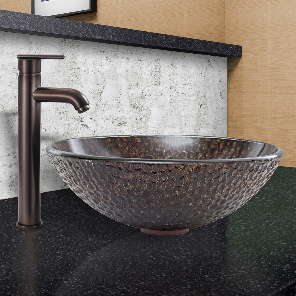 The VIGO Copper Shield Glass Vessel Sink and Seville Faucet Set in an Oil Rubbed Bronze Finish will create a rustic, yet elegant style for your bathroom.
