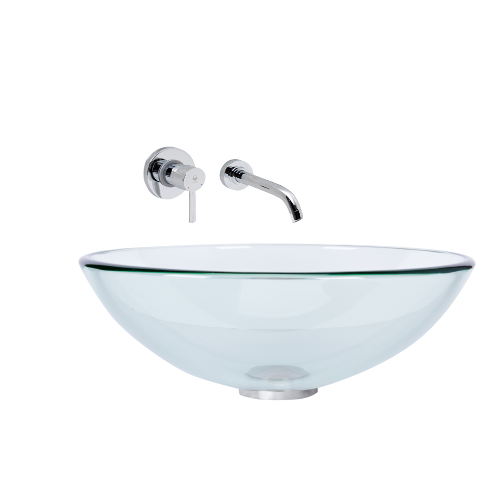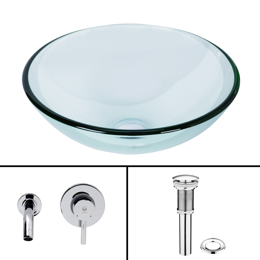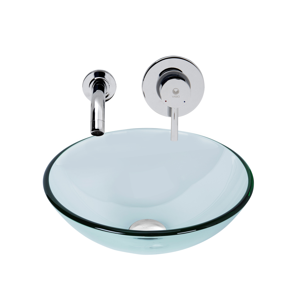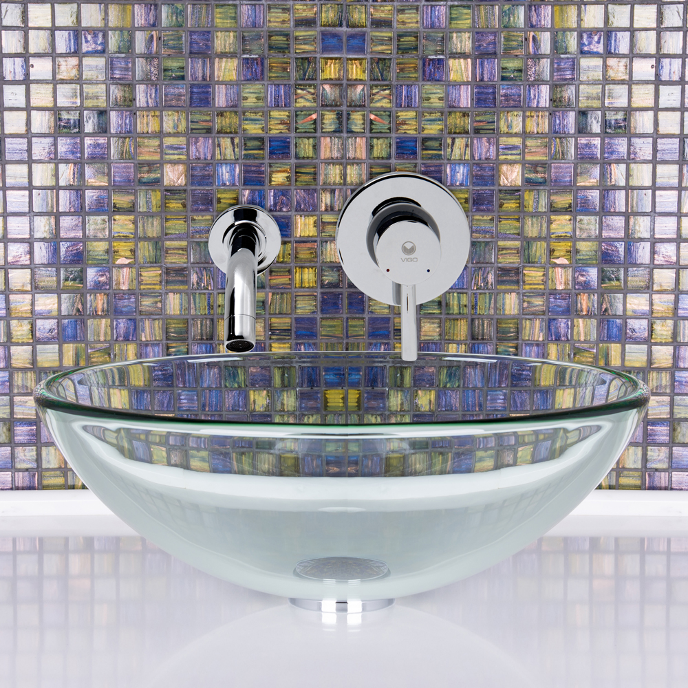 The VIGO Crystalline Glass Vessel Sink and Olus Wall Mount Faucet Set in a Chrome Finish is a luxurious and refreshing addition to any bathroom.