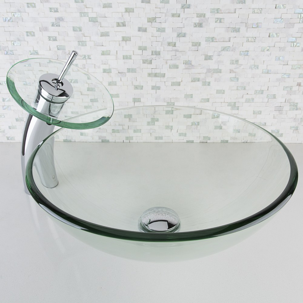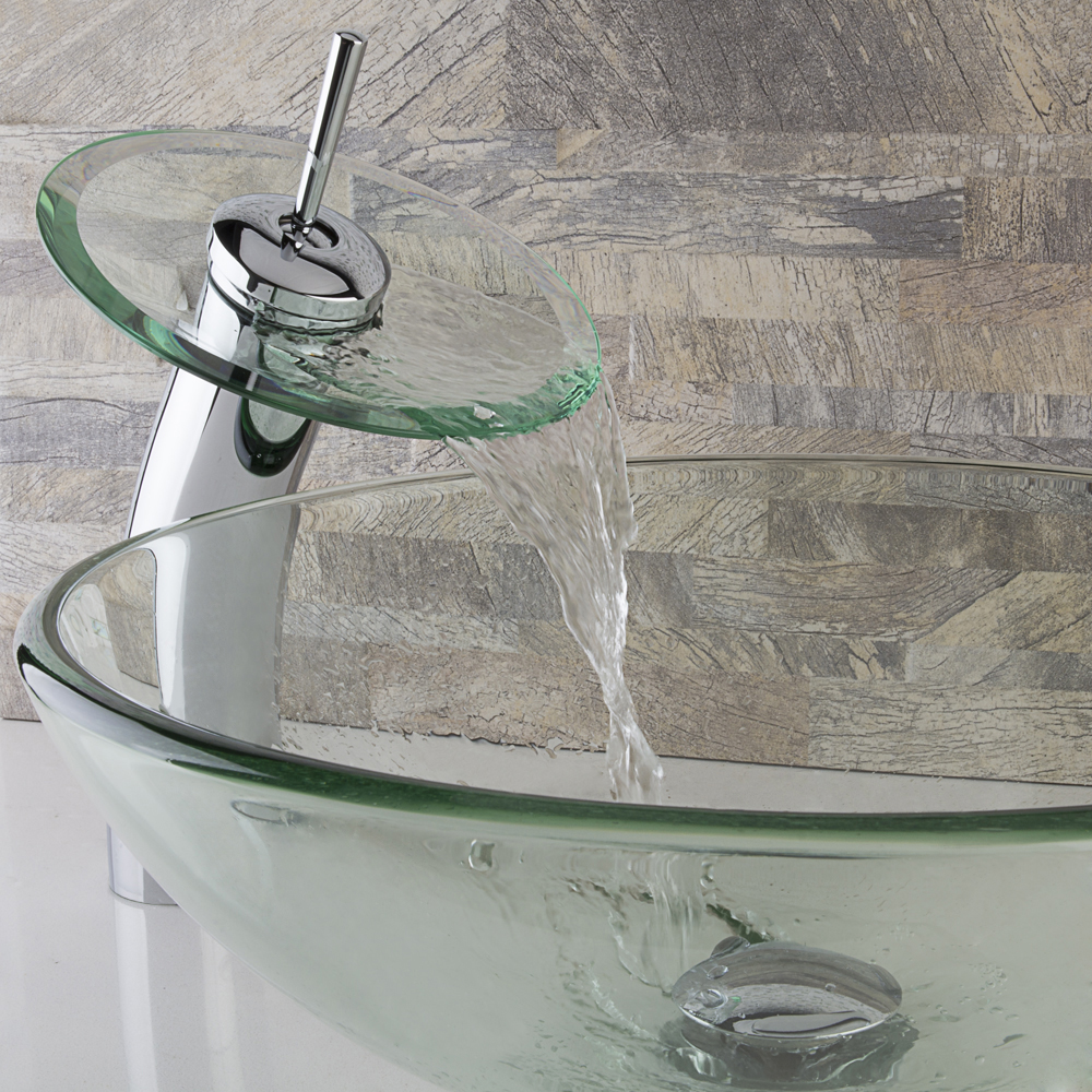 The crystal clear transparency of this glass ensemble fits with a wide variety of styles and color palettes, making it a versatile combination. Add in the soothing sound of water flowing over the waterfall faucet and it will make your bathroom feel like a luxurious four star resort.